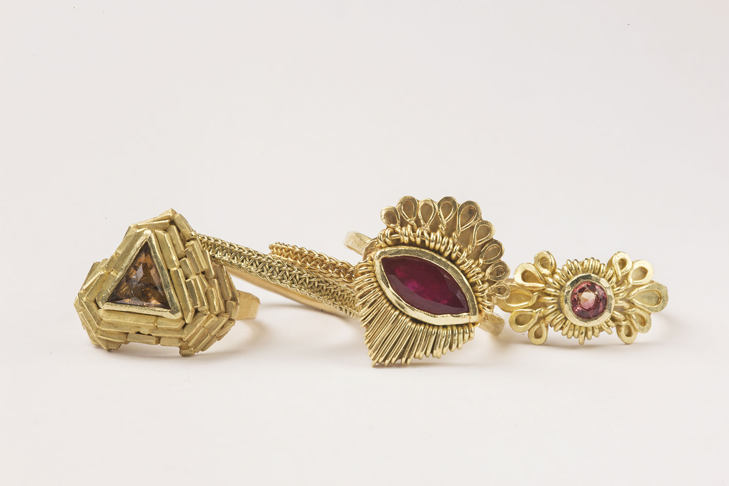 The Temple ring was inspired by the Banteay Chhmar crumbling Temple in Cambodia and is characterized by a smokey cognac diamond surrounded in bricks in disarray. The Woven ring was made with gold wire woven following a 13th century textile technique called finger loop weaving. Each element of the Ruby Magic Eye Ring is pulled, twisted and soldered in place, arranged to resemble an eye to protect the wearer.