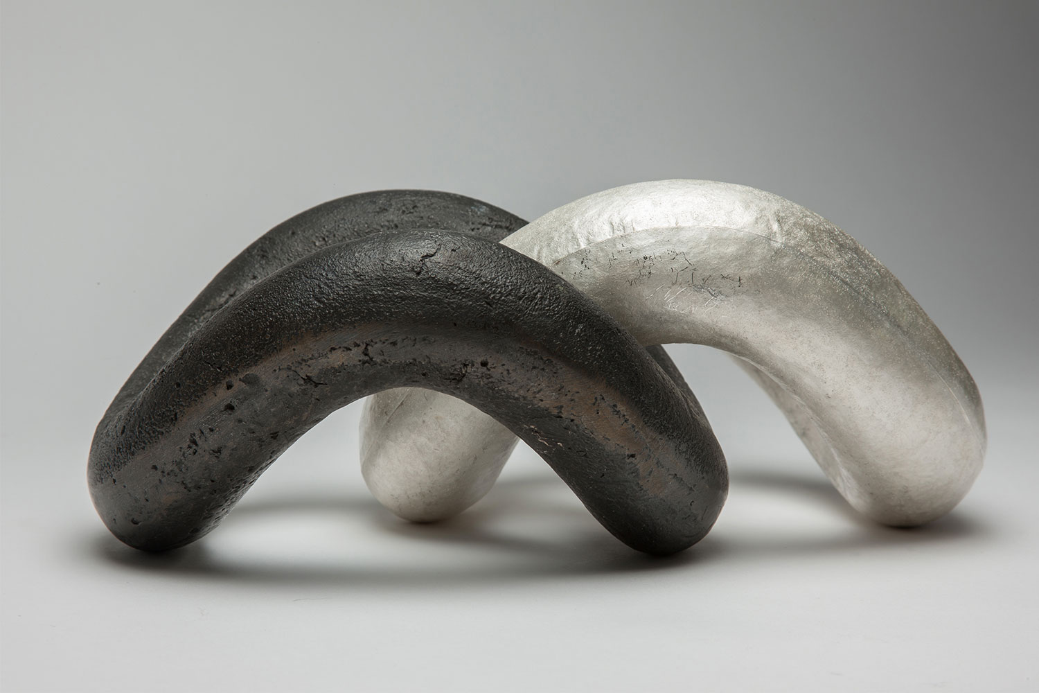 This sculptural piece composed of two links. The cast iron one, black and pitted in texture, showcases the sand casting technique. The other link is made of fine silver.