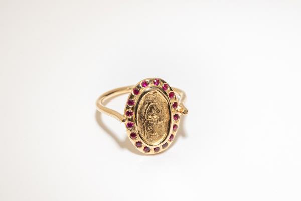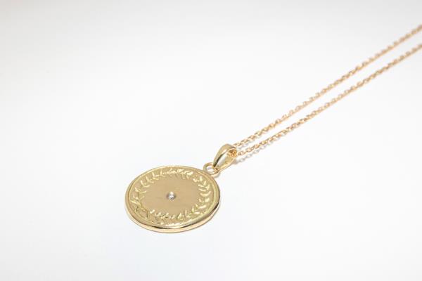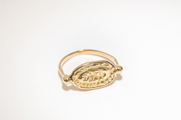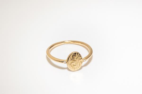 On this coin, a seated woman who is deeply lost in her thoughts was carved. Its organic shape and faded carving remind you of an antique piece. A 1mm diamond was set on the side to add a little sparkle.
