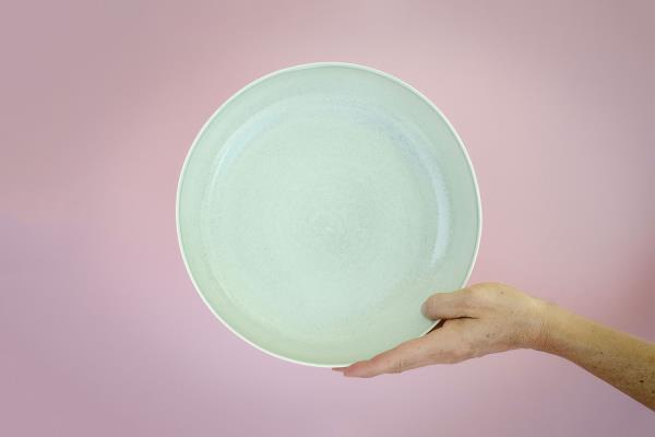 This bowl and accompanying plates were made by slip casting. The bowl was glazed with a homemade acqua verde glaze on the inside only. The black plate was made with black coloured porcelain. Both plates were glazed with a semi-transparent glaze on the top. All the pieces were fired twice in an electric kiln.