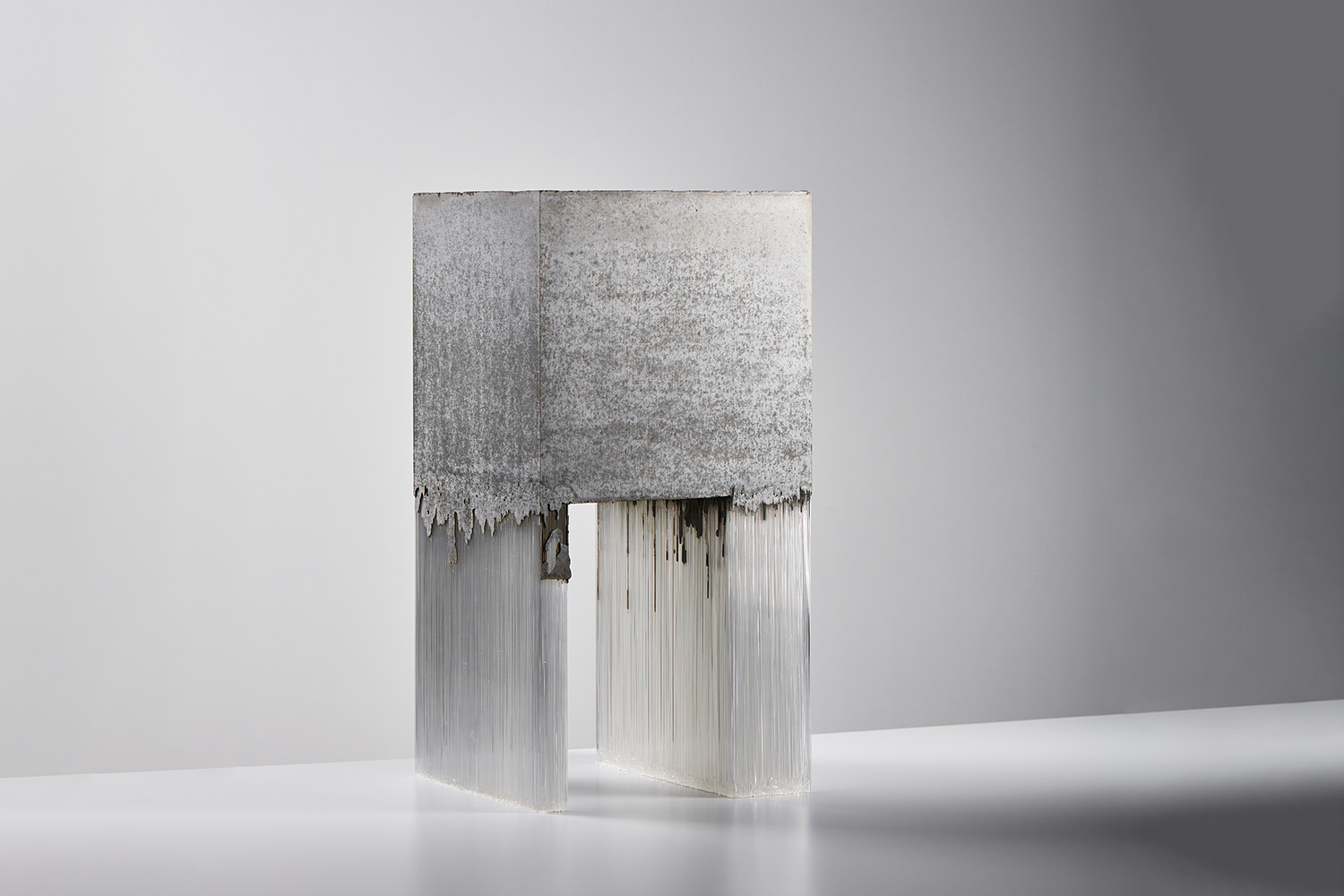 This sculpture contains clear glass threads and light grey concrete in a bridge form.