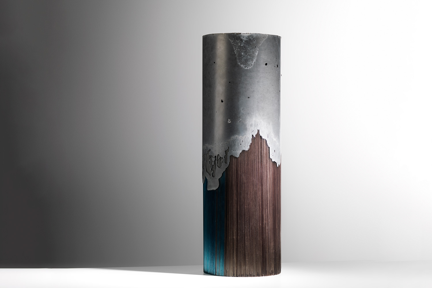 This sculpture contains blue and amber glass threads, and dark concrete in a cylinder form.