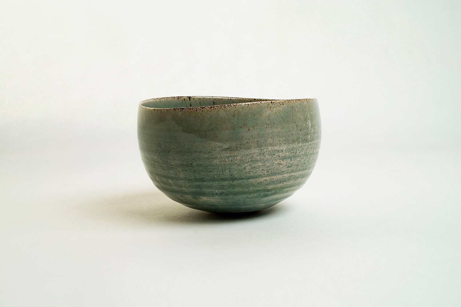 This oval, turquoise, stoneware bowl fits in the palm of a hand, making it very pleasant and natural to hold. It was shaped on a potter's wheel, hand altered and glazed with turquoise glaze and sprayed with iron oxide.