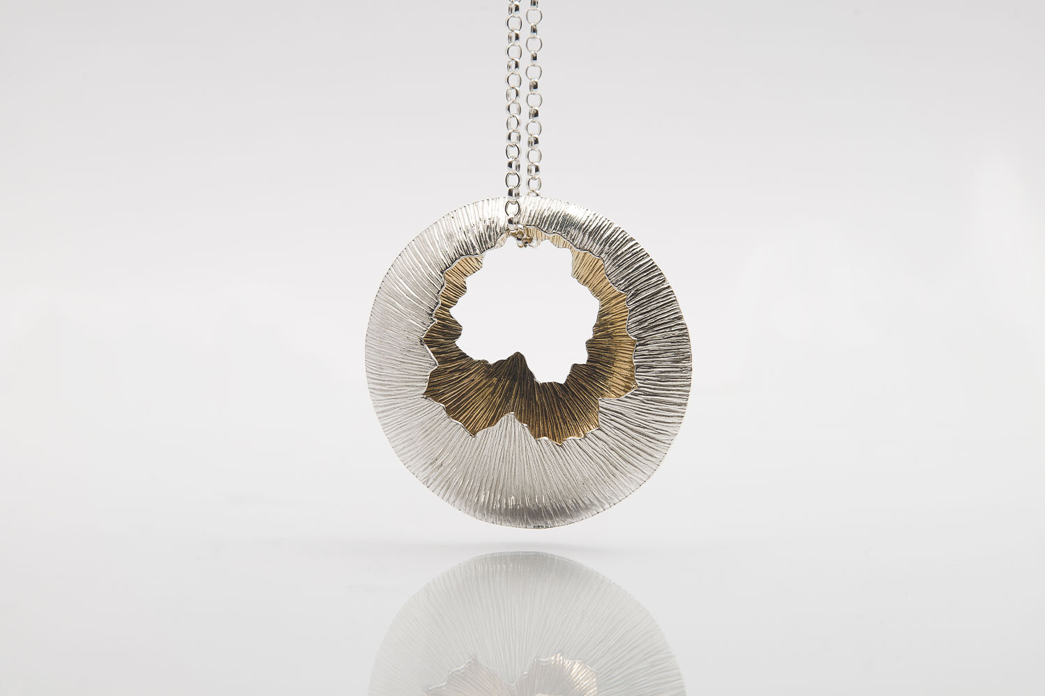 Many thematic elements are combined in Martina Hamilton's Golden Shore collection. This sterling silver pendant was inspired by rich imagery: broken urchin shells, striations of sand after an outgoing tide, the rise of the moon and the setting of the sun on a north Sligo beach near Martina's home. Elements of the pendant were hand plated in 22k gold.