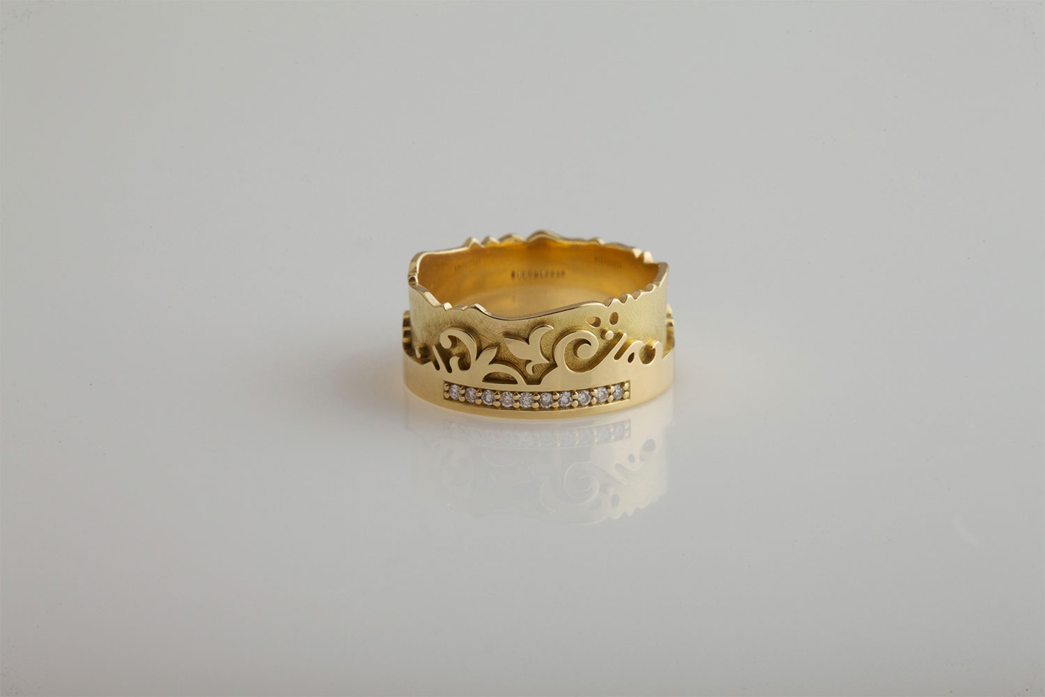 This gold ring features an irregular edge at the top and a floral pattern that encircle the entire finger. Fern flower is a mystery of nature. In Lithuanian language, the same word indicates "ring" and "blossom". If you hold it in your hand, it feels like a small but significant miracle. Prosperity of midsummer joy.