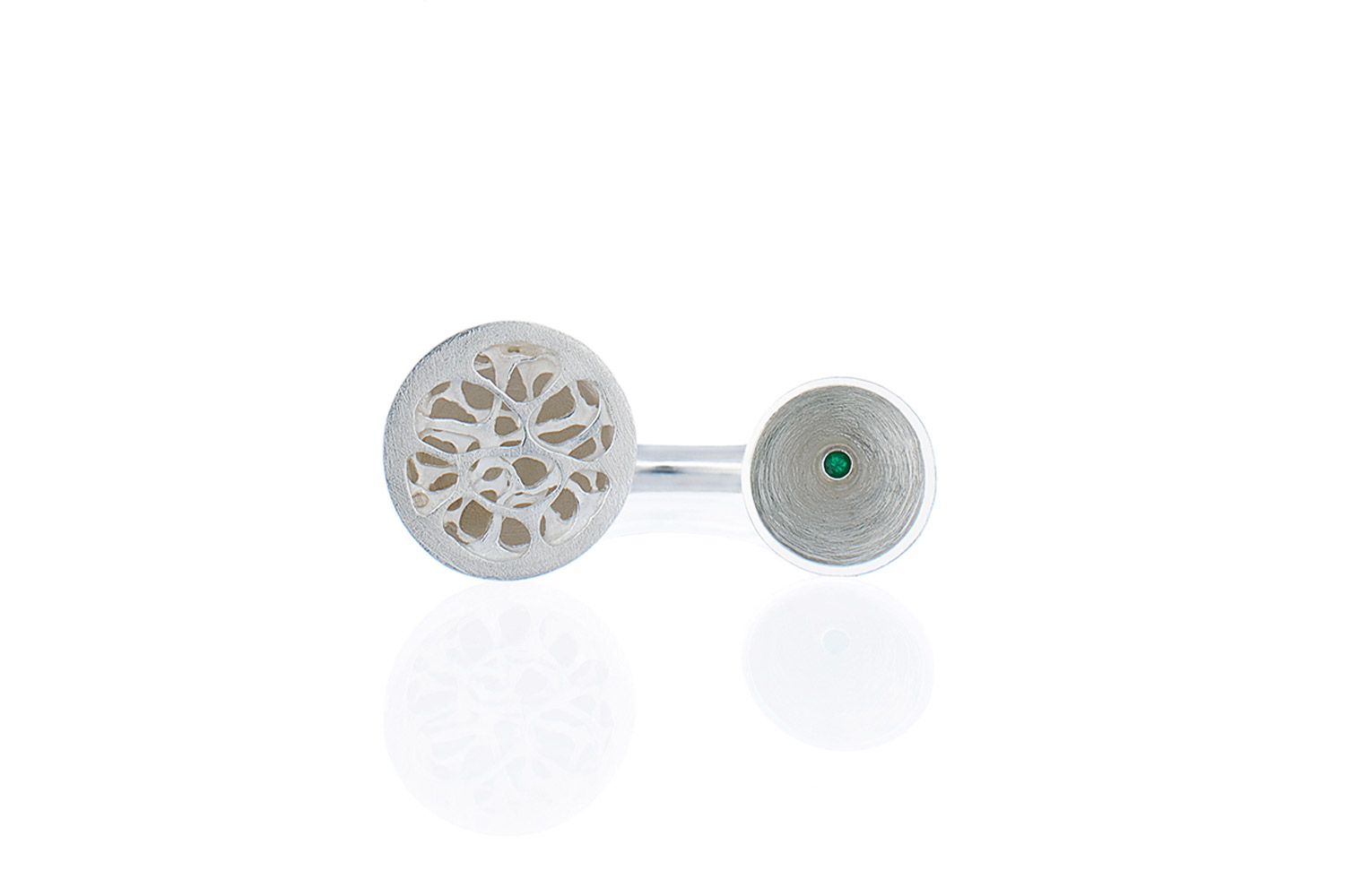 Part of the Mimesis & Embrio series, this ring was handcrafted in silver and adorned with precious emerald. The concept behind the collection is expressed in each jewellery by exposing different layers of materials in order to suggest that something is hidden. In these works, Alis explores the themes of metamorphosis, growth & development.