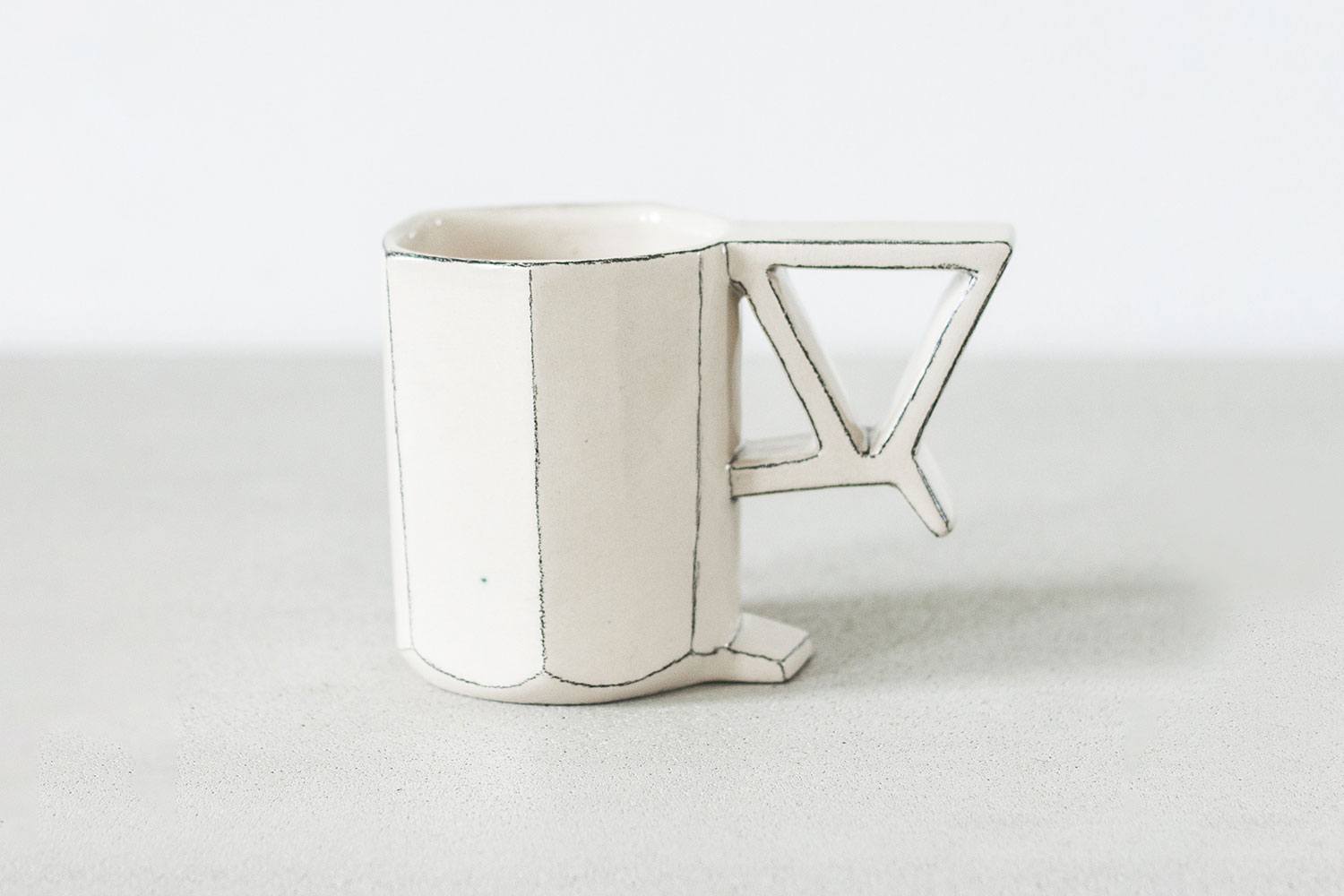 From The Architecture of the Mug collection, this piece is intended for everyday use and to decorate an interior space. A unique cylindrical ceramic mug, moulded out of high quality white fireclay, it is coated with glossy glaze and painted with a special black pencil. Its distinctive handle was inspired by architectural elements, industrial complexes, and ancient and futuristic places.