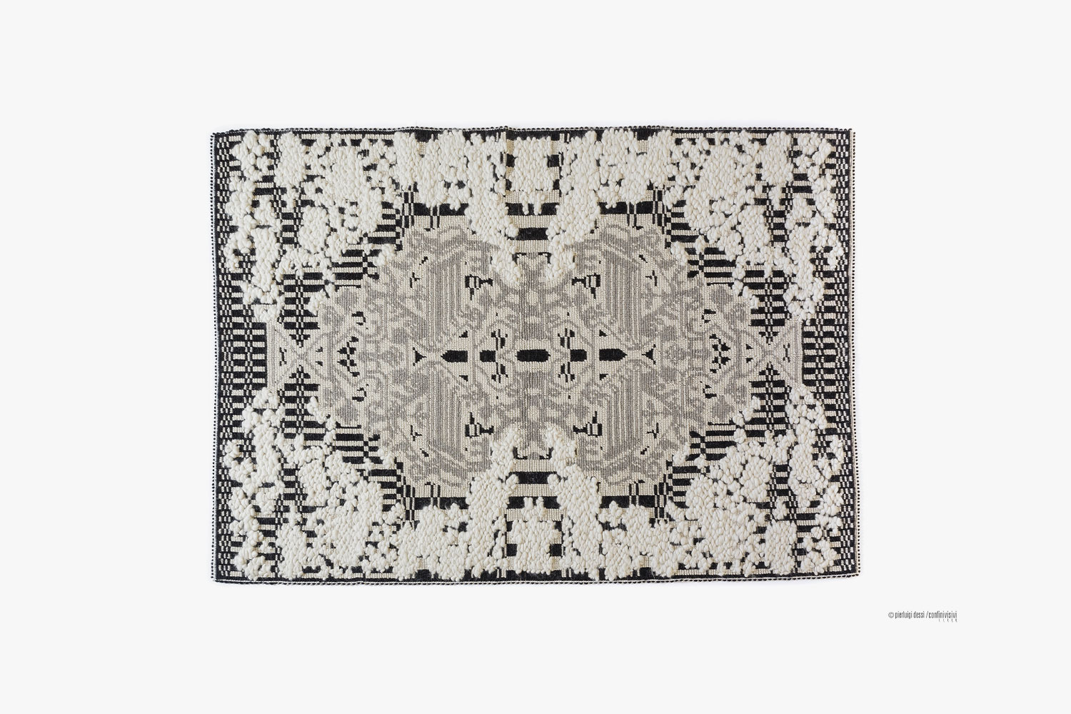 The idea for this carpet was born from the evolution of the typical design to Samugheo textile tradition called Blooming Bird. In collaboration with designer Caterina Quartana, master weaver Mariantonia Urru revisits this traditional design with a modern version. To bring the idea to life, the design of a traditional saddlebag was combined with the carpet. This duality evokes that of Sardinian culture, where work and home “were the main aims of every man and woman building their own future and their family.”