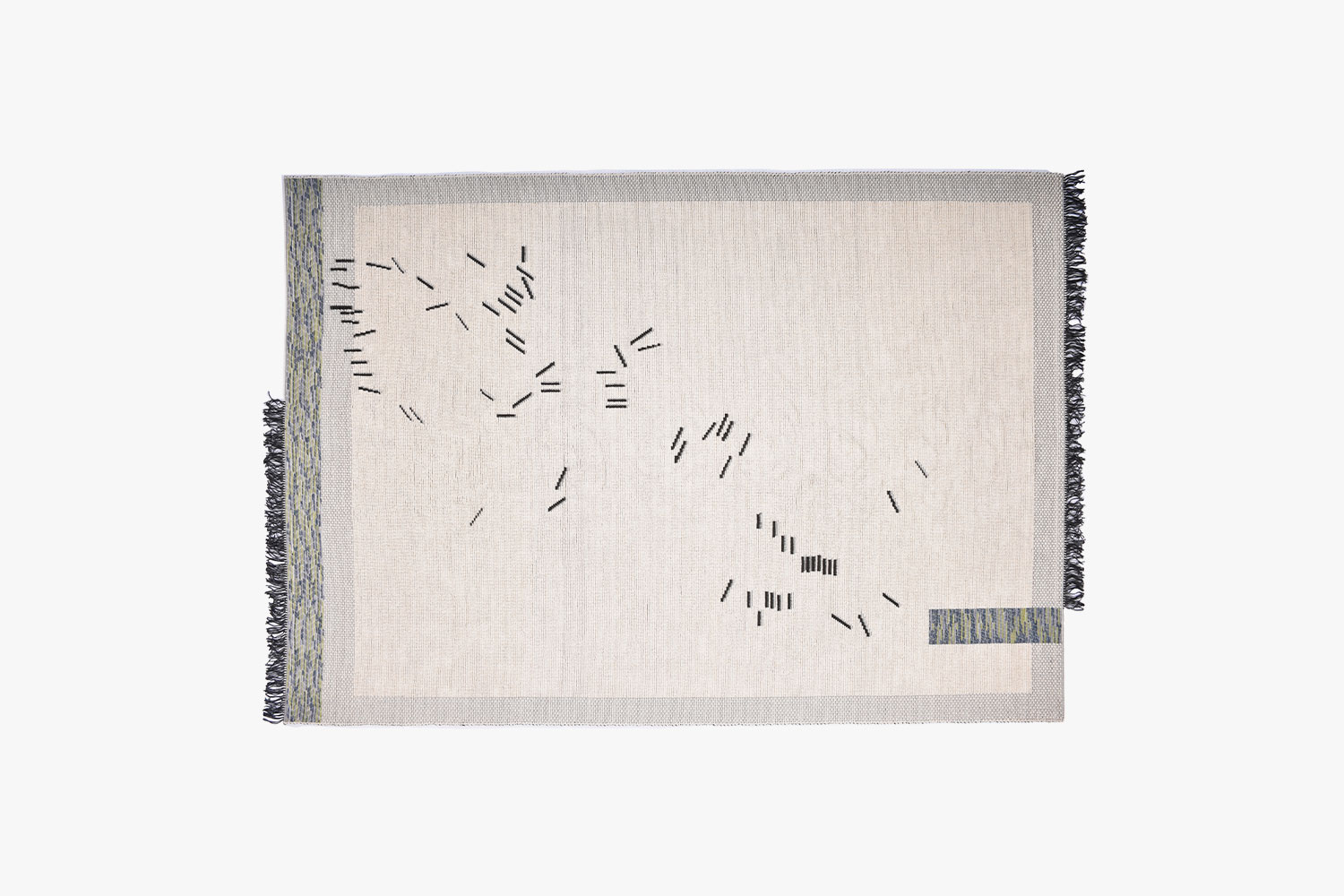 The design of this carpet, handwoven by Mariantonia Urru, combines two lines of research carried out by the designer Paulina Herrera: the landscapes of Sardinia and the dynamic perception of spaces. The image represents a map of the movement of boats in a port in the north of the island, over a day. The concept of dynamics led to the innovative composition of the yarns to reflect the movement of water in the perimeter of the carpet.