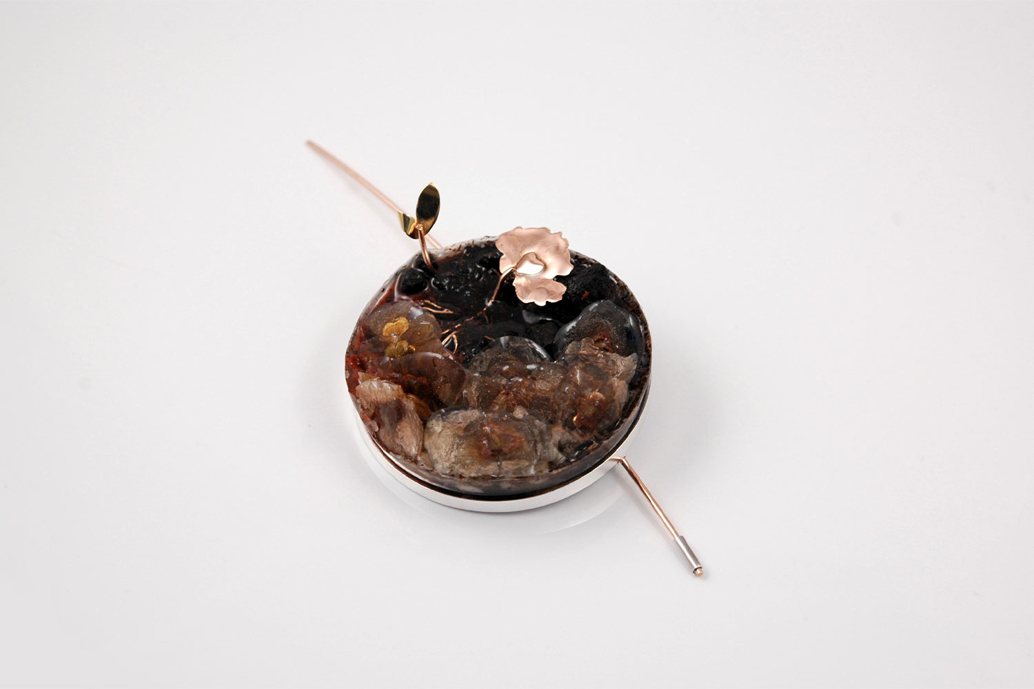 The inspiration for this brooch came from the biblical Parable of the Four Soils. Andreia wanted to present all four hypostases of the seed that fell on different types of soil: hard ground, stony ground, thorny ground and good ground. She used natural Jacaranda tree seeds and different types of soil. But only the good ground receives the seed and allows it to germinate and grow. So in that soil she 'planted' a golden seed that takes root and then gives birth to other precious golden plants.