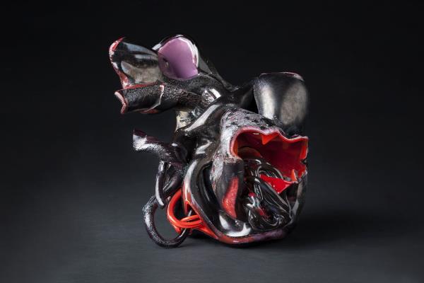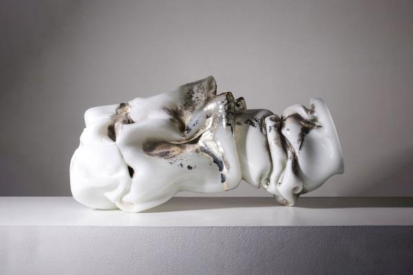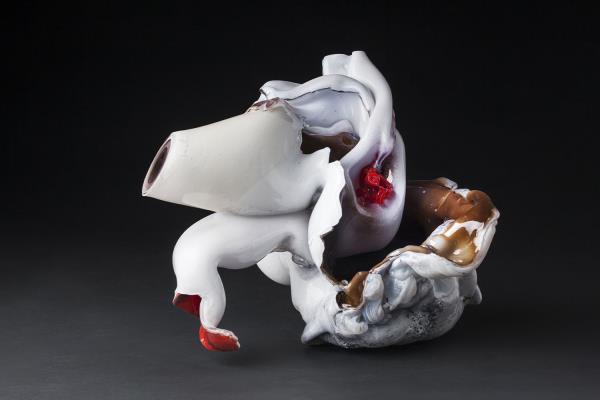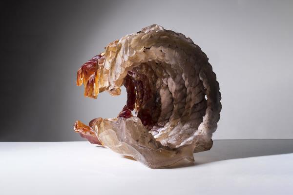 This orange glass sculpture is from Maria Koshenkova's Restrain and Release series, created while in Japan. The series drew inspiration from the Japanese bondage practice of Shibari, characterised through its amalgamation of control and submission. Maria modelled for a Shibari master and translated the experience into glass shapes. This glass sculpture represents Maria's own body in conversation with rope.