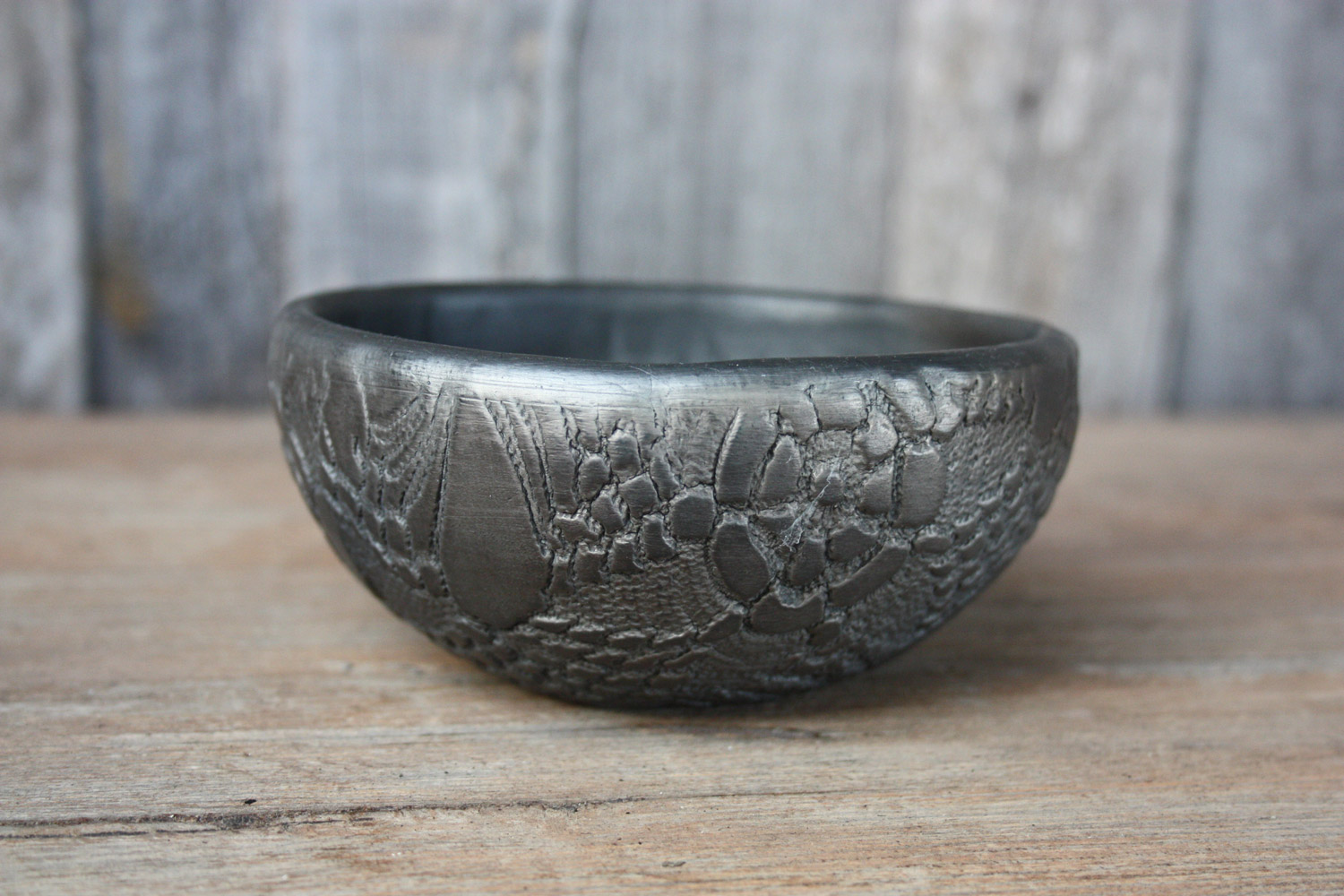 This unglazed hand-shaped bowl was adorned with a lace texture. It was burned on a fire flame in a pit-type wood kiln.