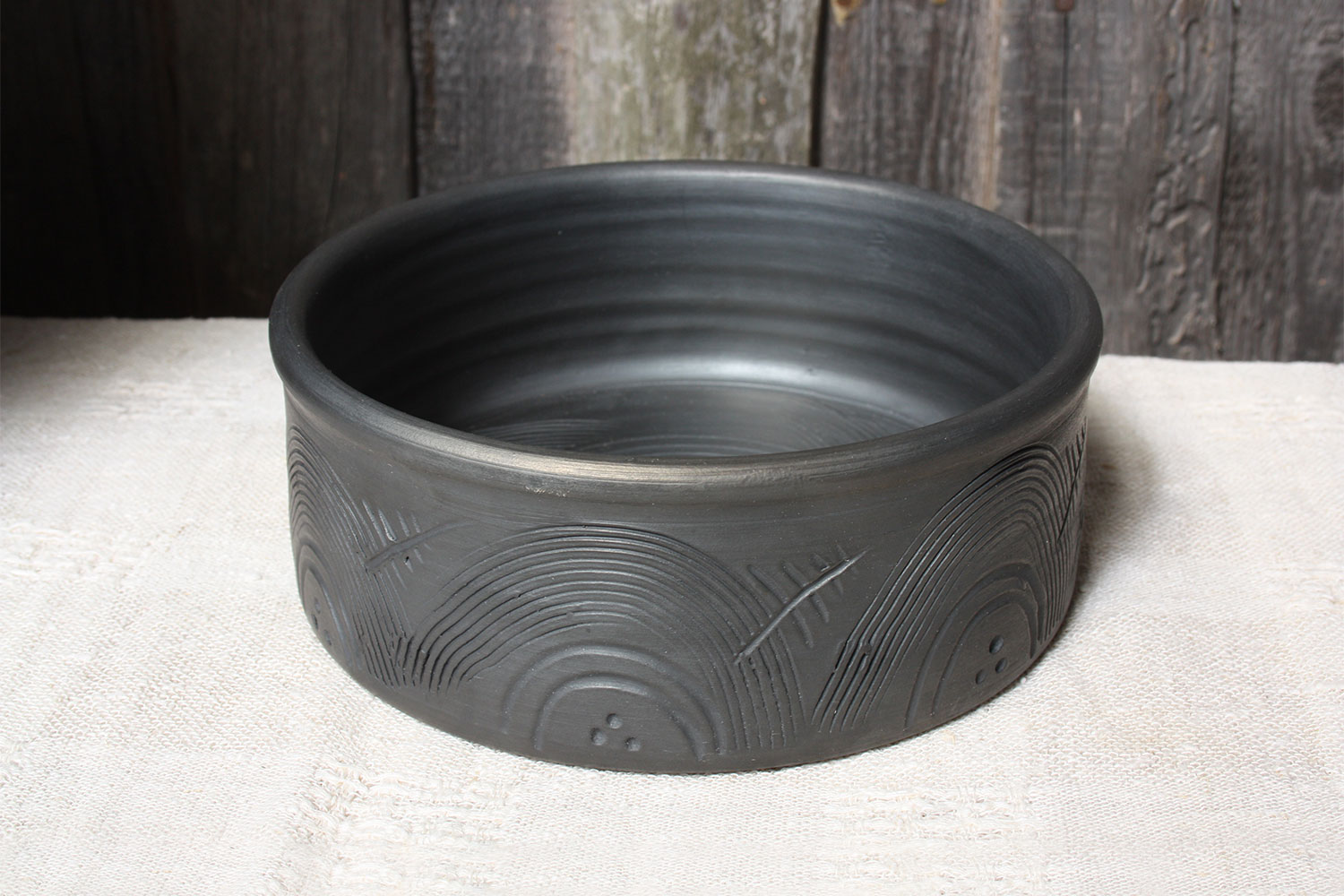 This black unglazed bowl was made on a potter's wheel and fired in a pit-type wood kiln. Its outer surface has been decorated by hand.