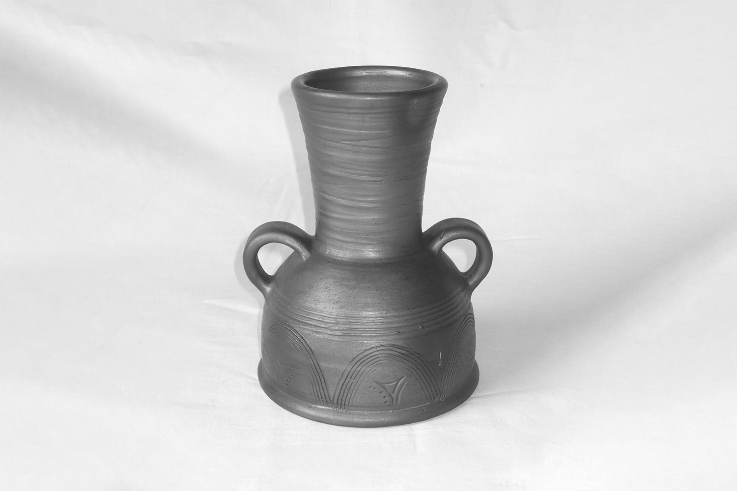 This unglazed vase was made on a potter's wheel and fired in a pit-type wood kiln. Its outer surface has been decorated by hand.