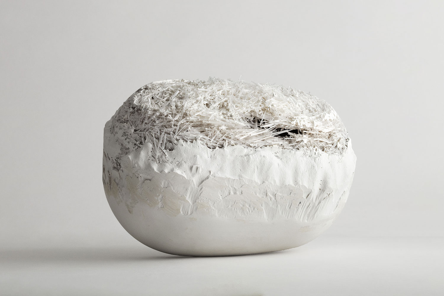 The cocoon shaped piece draws inspiration from a fictive winter scene. It is composed from kiln-worked glass and stringers, and cast into one with gypsum. The title refers to the peaceful calm winter days, known as “Halcyon days“ which originates from Greek mythology.