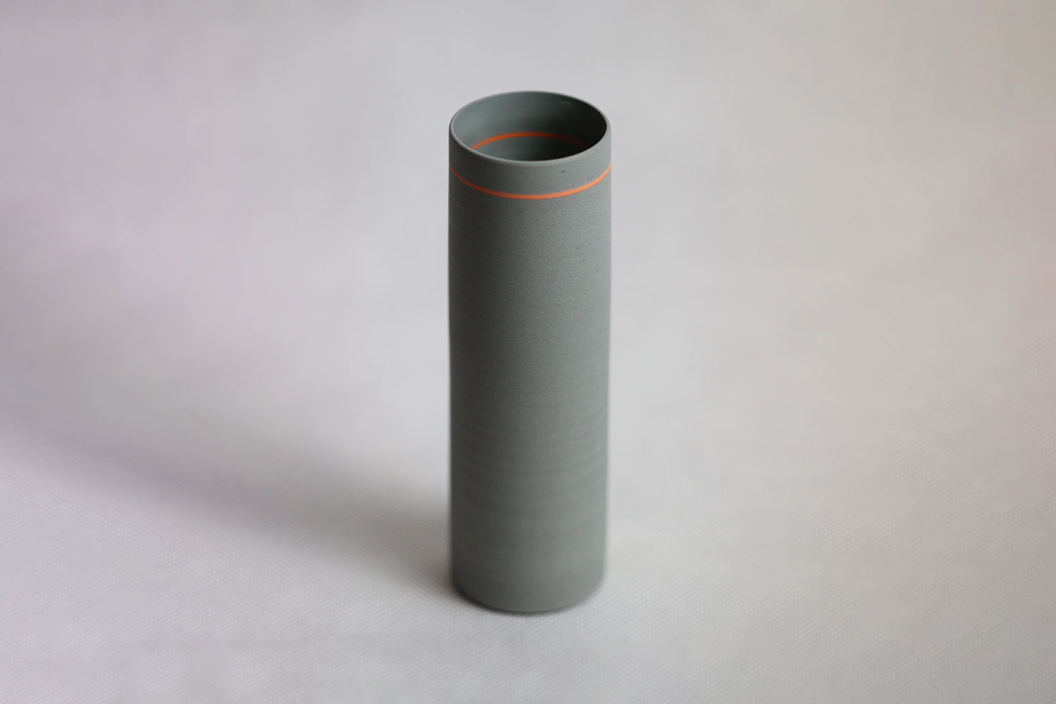 This wheel-thrown grey Herend Porcelain vase with orange inlay details is glazed inside, and unglazed, and polished outside. Chloë made this vase in residence at the International Ceramics Studio, Kecskemét, Hungary in August 2019. The orange inlay gives the impression that the line goes right through the piece. This vessel is part of a series inspired by the colour experiments of Josef Albers.