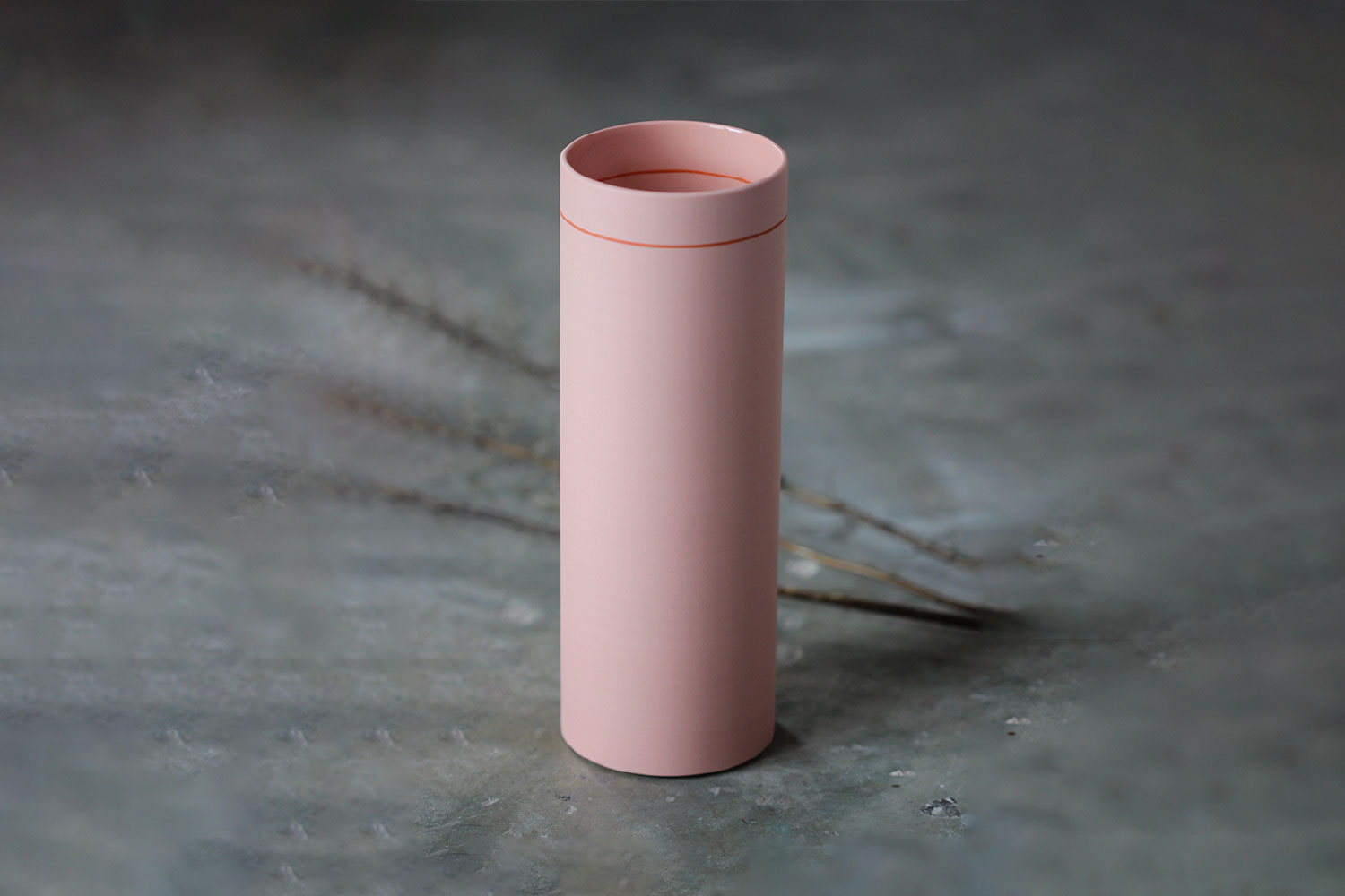 This wheel-thrown pink porcelain vase with orange inlay details, is glazed inside and unglazed and polished outside. The orange inlay gives the impression that the line goes right through the piece. This vessel is part of a series of work inspired by the colour experiments of Josef Albers.