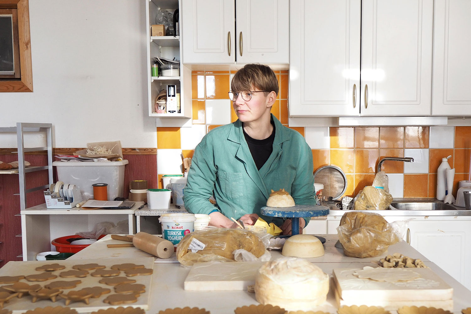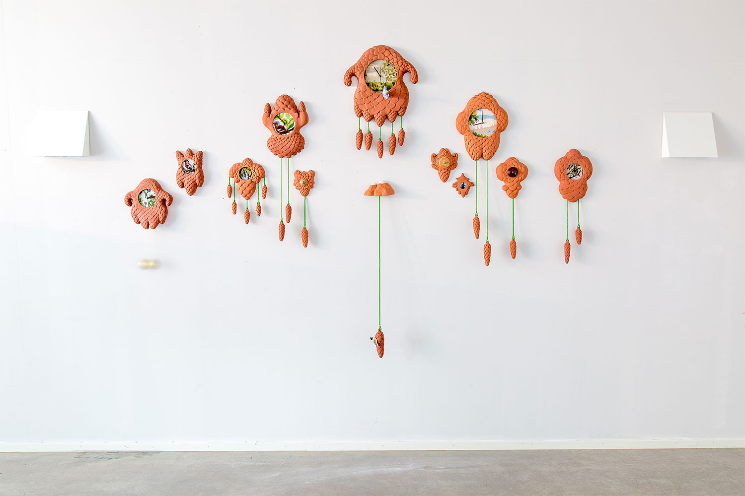 These wall clocks of various sizes are modelled in red earthenware clay. The shapes are inspired by old, decorative cuckoo clocks.