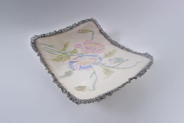 The principal motifs in Rasa Justaité-Gecevičiené's creations come from her observation and interpretation of plants, which express the perpetual motion of nature, unique and surprising. This glazed stoneware sculpture was inspired by the imagery of frosted grape vines. Rasa has included metal detailing on the ceramic sculpture, representing the vine.