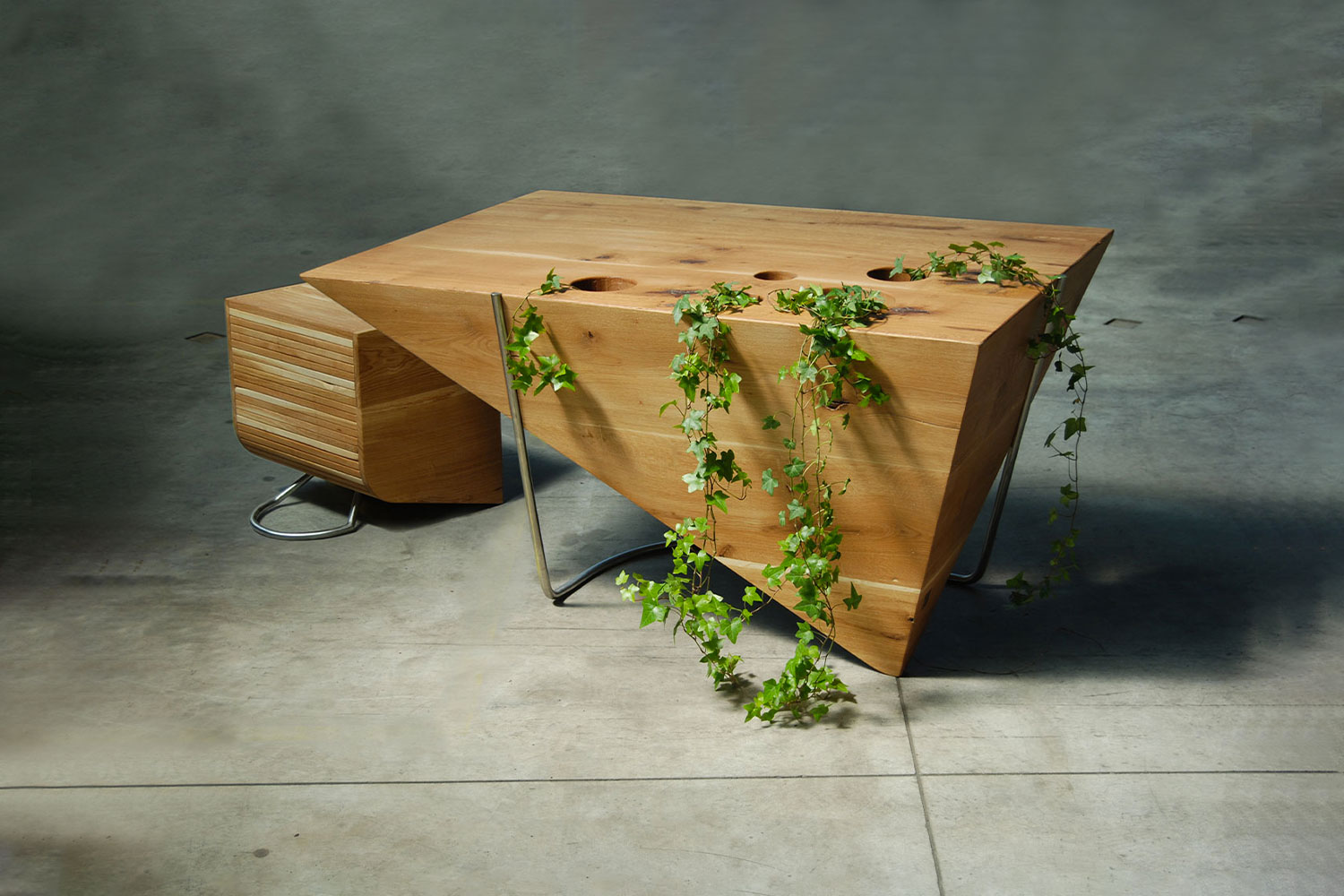 This desk was created as a balance experiment, by inverting a wooden pyramid to make a functional object. It has a large surface area and combines solid oak construction with a stainless steel support frame. As the strict geometry of the piece called for a natural touch, Ciprian added some round holes to the desktop and allowed green ivy to flow through them.