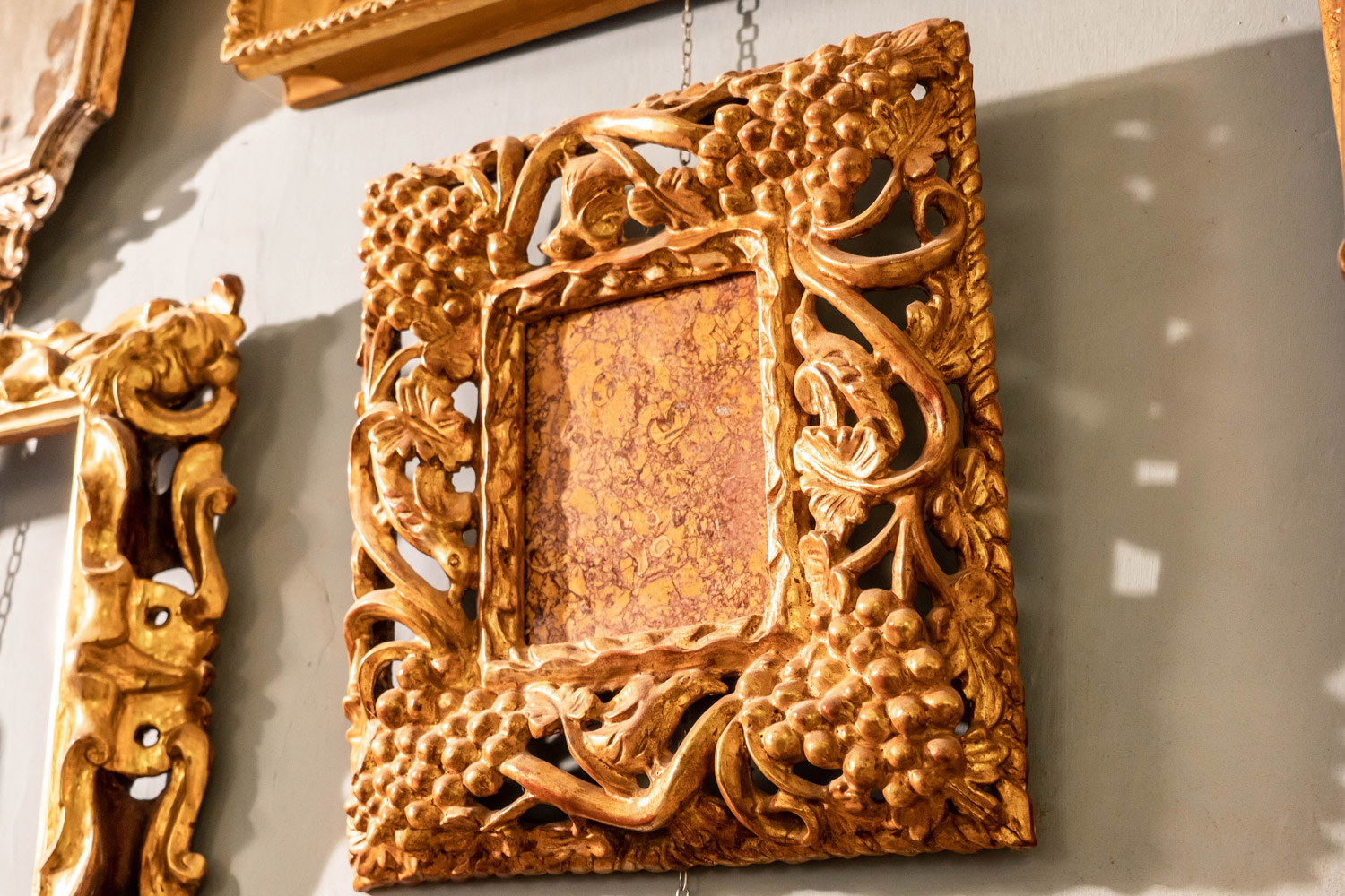 This frame is hand carved from linden wood and finished with 22 karat gold leaf. The frame was carved with intricate designs of grapes and vine leaves.