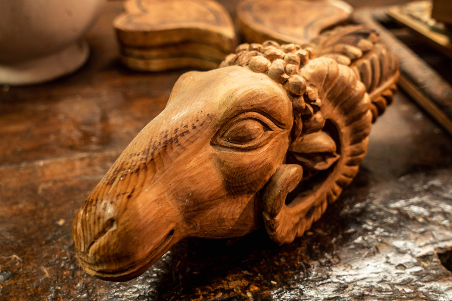 Wood carved ram’s head