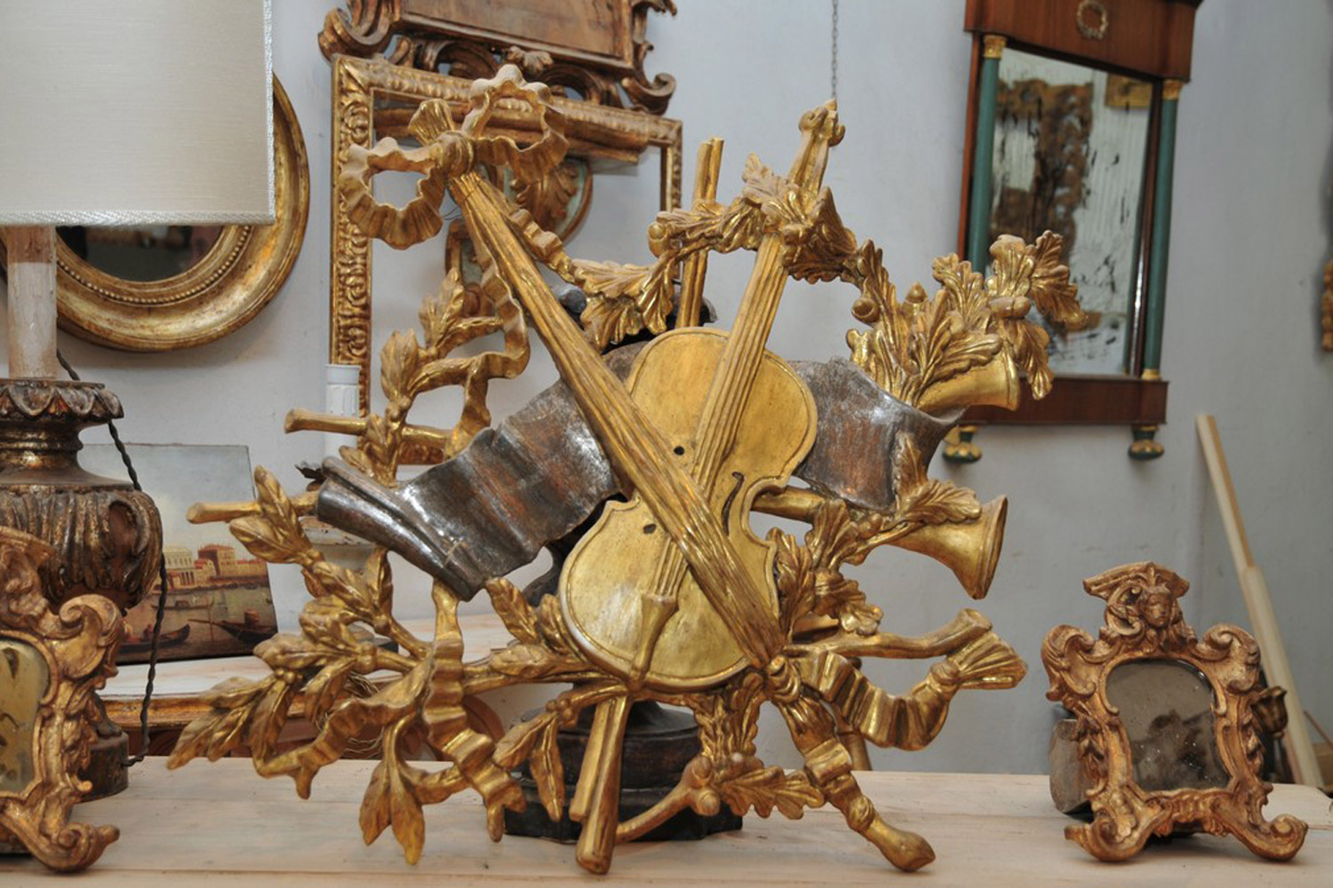 This decorative piece, a musical allegory portrayed through a violin, music sheets and floral designs, was hand carved by Carlo Puccini from linden wood. The piece was finished with 22 karat gold and sterling silver leaf finishing.