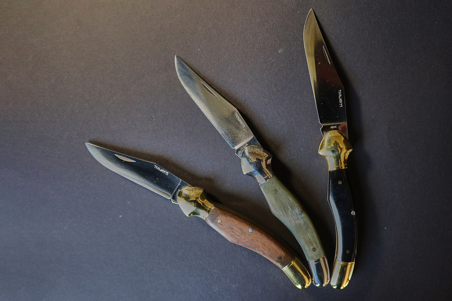 Based on the design from the early modern era, this pocket knife is made in the shape of a sabre. Ideal for those with a firm grip, it fits easily into the palm of the hand and is suitable for any purpose. The blades are made from stainless steel and are also available in carbon steel. The handles are made from cattle horn and the handle is adorned with copper, stainless steel and alpaca.