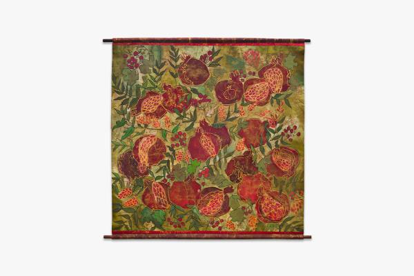 The wall hanging named “Georgians” is hand painted on silk fabric. The wooden frame is attached to the top and bottom of the piece. It features three horizontal rows of male and female figures (six per row) dressed in traditional Georgian costumes, typical of different regions of the country. The floral motifs are used to frame the composition and divide the rows. The pallet is warm, consisting of yellow ochre, brown and red tones. White accents of flowers on the outside border and on the faces of the figures add a symmetrical, decorative rhythm to the particular piece of work.