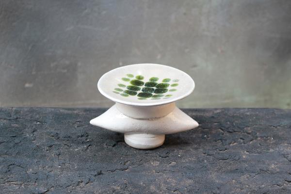 This ceramic object was made with chamotte using the slab building technique, fired at 1,150°C. The shape consists of a round body and four adjunct open-top tubes covered with dark brown glaze. Being part of a collection of other vases of a similar style made using the same technique, the object is inspired by the ancient Georgian tradition of ceramic wine ware, in which one vessel often combines many small inter-connected parts, and was used as a shared drinking vessel during feasts.