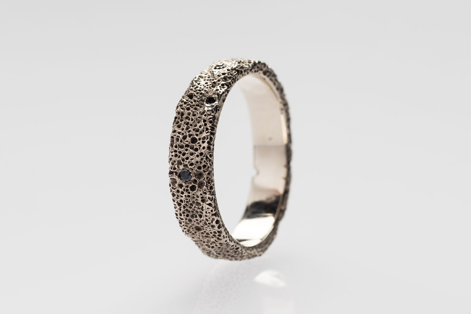 This white gold engagement ring, encrusted with back diamonds, was made to measure for a client.
