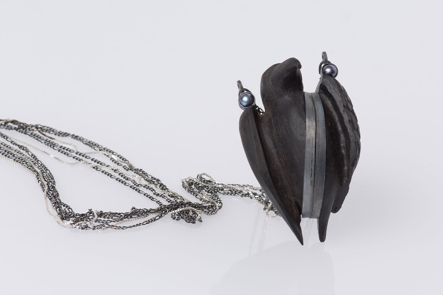This silver, ebony and blue pearl pendant drew inspiration from the form of a raven. The idea for it came when Rūta met a man who reminded her of this sombre bird.