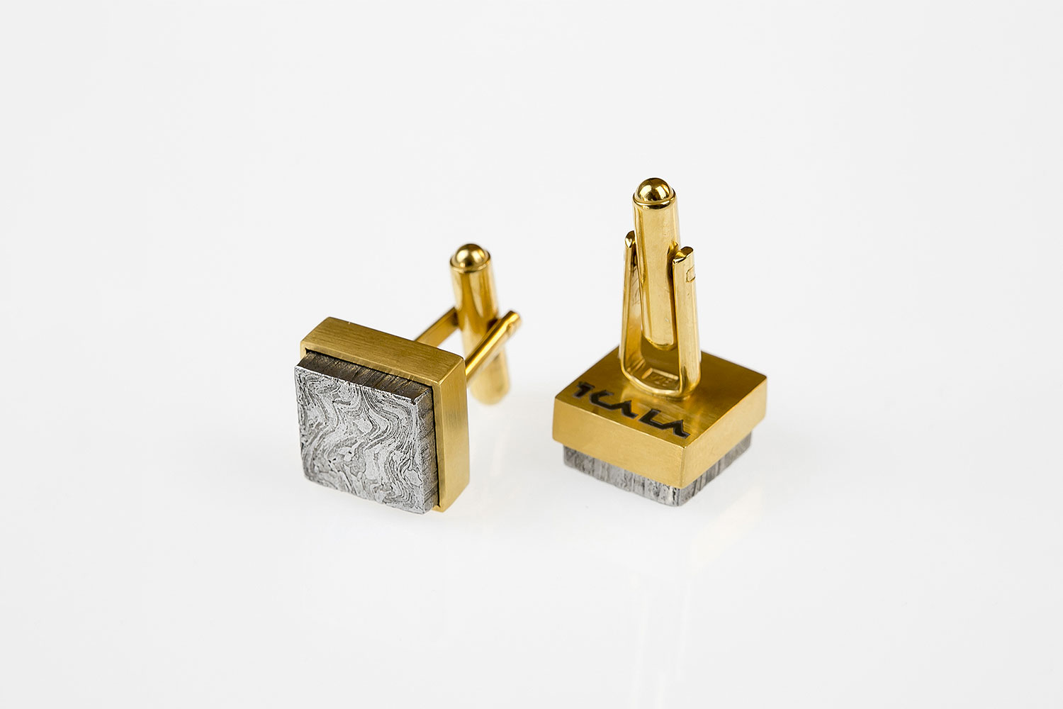 These Damascus steel and gold-plated silver cufflinks are part of Rūta's Kala collection, inspired by traits of masculinity. This project was presented in an abandoned factory. The 3,000m2 presentation space was decorated with eight huge photos of blacksmiths and eight pieces of jewellery.