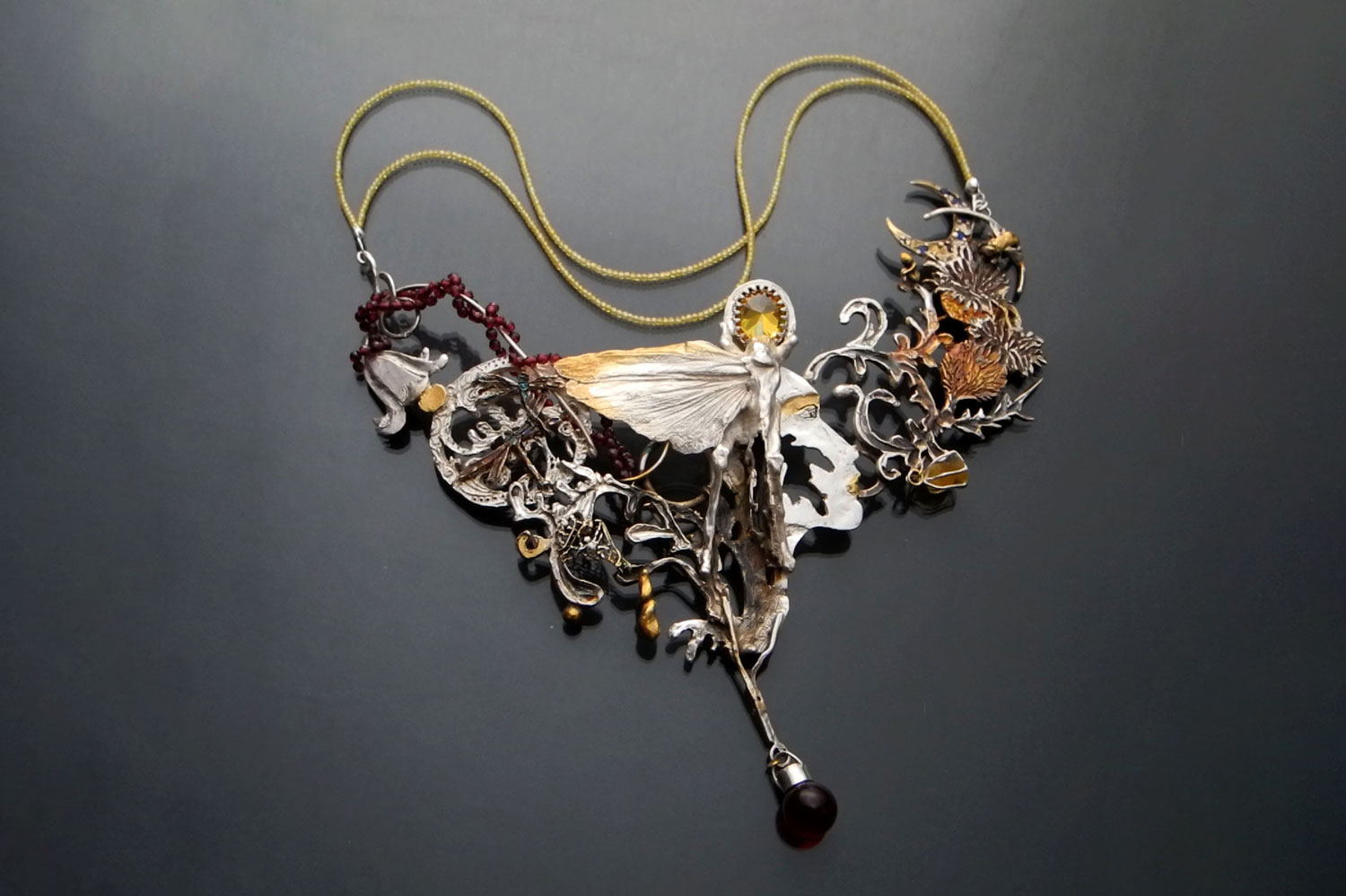 Gold-plated silver necklace, that at first glance exudes Art Nouveau elegance. But on the second look the details reveal cracks, holes, spider webs, insects and a tiny human. The bottom glass bulb is filled with raspberry juice, the cage holds amber, the thistles are enamelled, and the moon is adorned with synthetic sapphires. The cords are made of faceted citrines. This necklace was exhibited in the Guizhou National Museum of China.