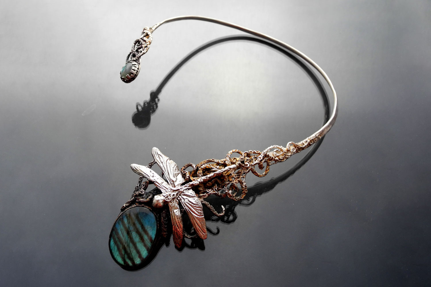This silver necklace features a large labradorite in its centre, which attracts a silver dragonfly like it is a water pond. The composition is closed with a moonstone. The silver decorations are chemically coloured from black to brown, to goldish, to silver, to white.