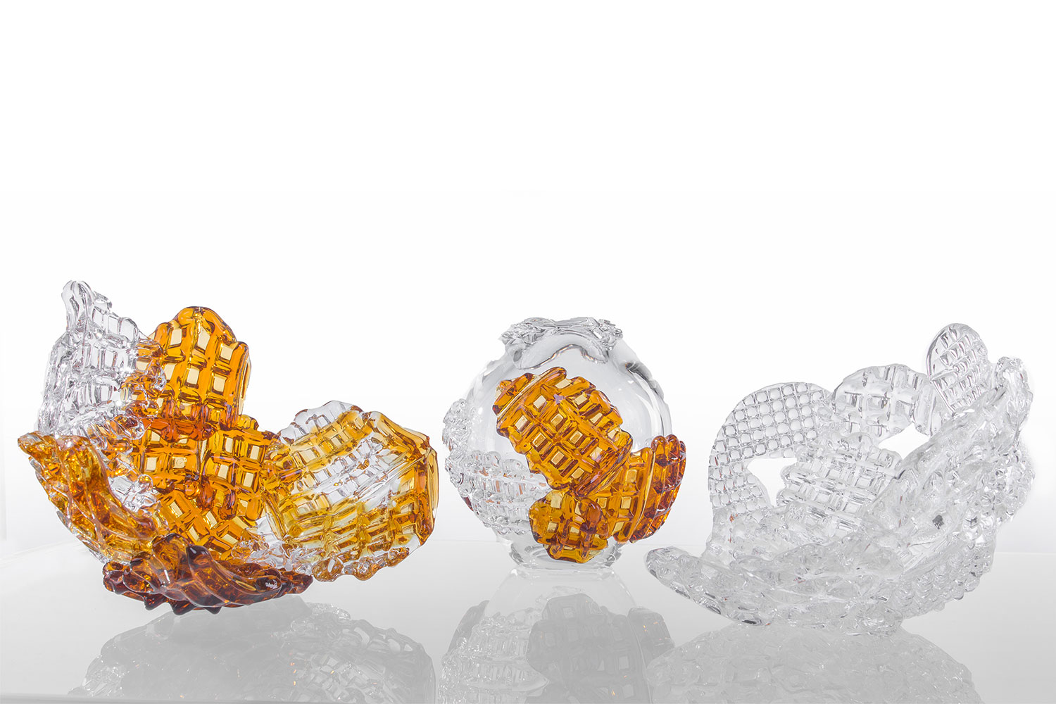 These objects were handcrafted with crystal and amber glass. Each element was cast with a waffle iron and hand shaped, before the pieces were assembled to create the final object.