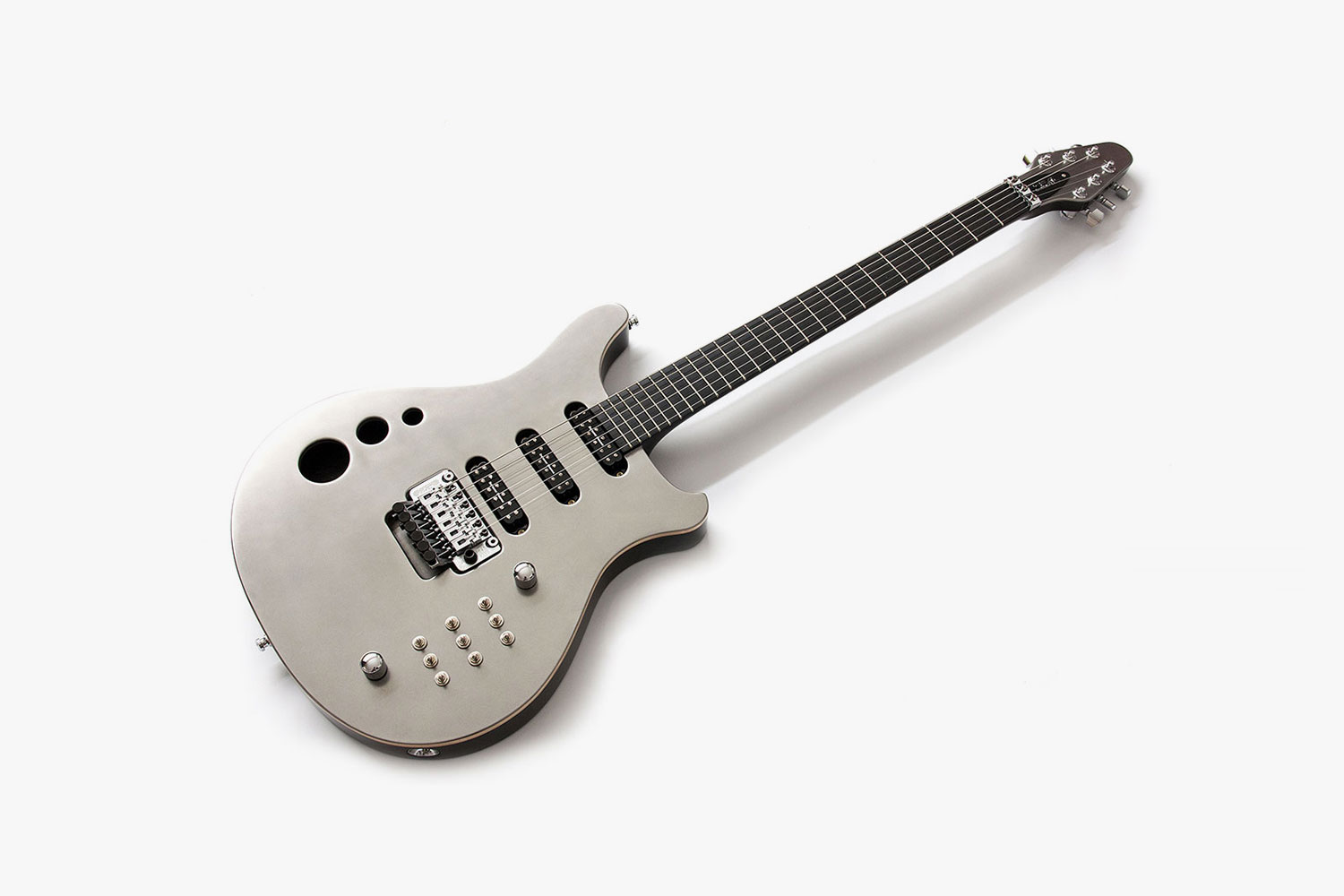 This instrument was designed for a special customer, and was inspired by Frank Rohles's and Brian May's self-made guitars. Bastian deviated from the original idea of a red stained top in favour of his 'Real Steel' finish – a coating made of steel powder, which is applied in a special painting process and then sanded and polished to a high gloss. He stained the back completely black and lacquered it to create a high gloss. The top is set off by a natural binding.