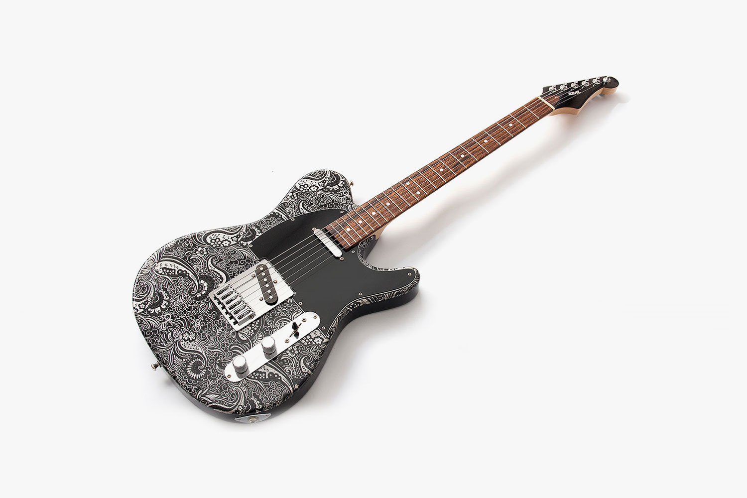 The Black Paisley is covered with real brocade fabric which was glued on the front surface of the guitar prior to the finishing process. Several layers of lacquer were applied and then sanded back to create a completely flat and even surface. The back and sides were painted in solid black to cover the transition from the edge of the fabric to the wood. A final layer of lacquer was then applied, polished and buffed to a high gloss finish.