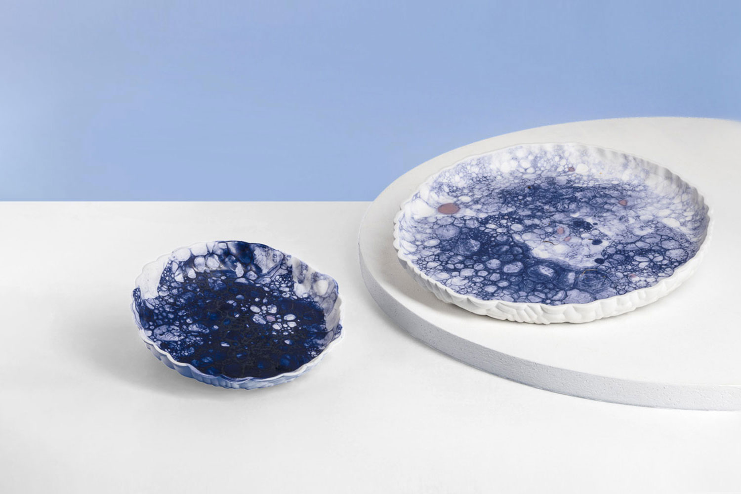The Dekopr collection combines the basic forms of traditional rustic tableware with three-dimensional ornamentation made by etching patterns into the plaster moulds used to cast the porcelain. The plates were then finished by applying cobalt pigment in different intensities. Pavla drew inspiration from winter landscapes and the patterns left by pine needles on the snow.