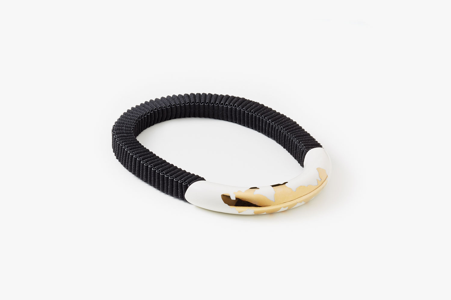 The geometrical Duchess collection was inspired by Renaissance collar ornaments and aims to present modern versions of the period's distinctive accessories. These semicircular porcelain necklaces, bracelets and belts are plated in a 10 percent solution of gold and platinum and complemented by pieces of pleated textile.
