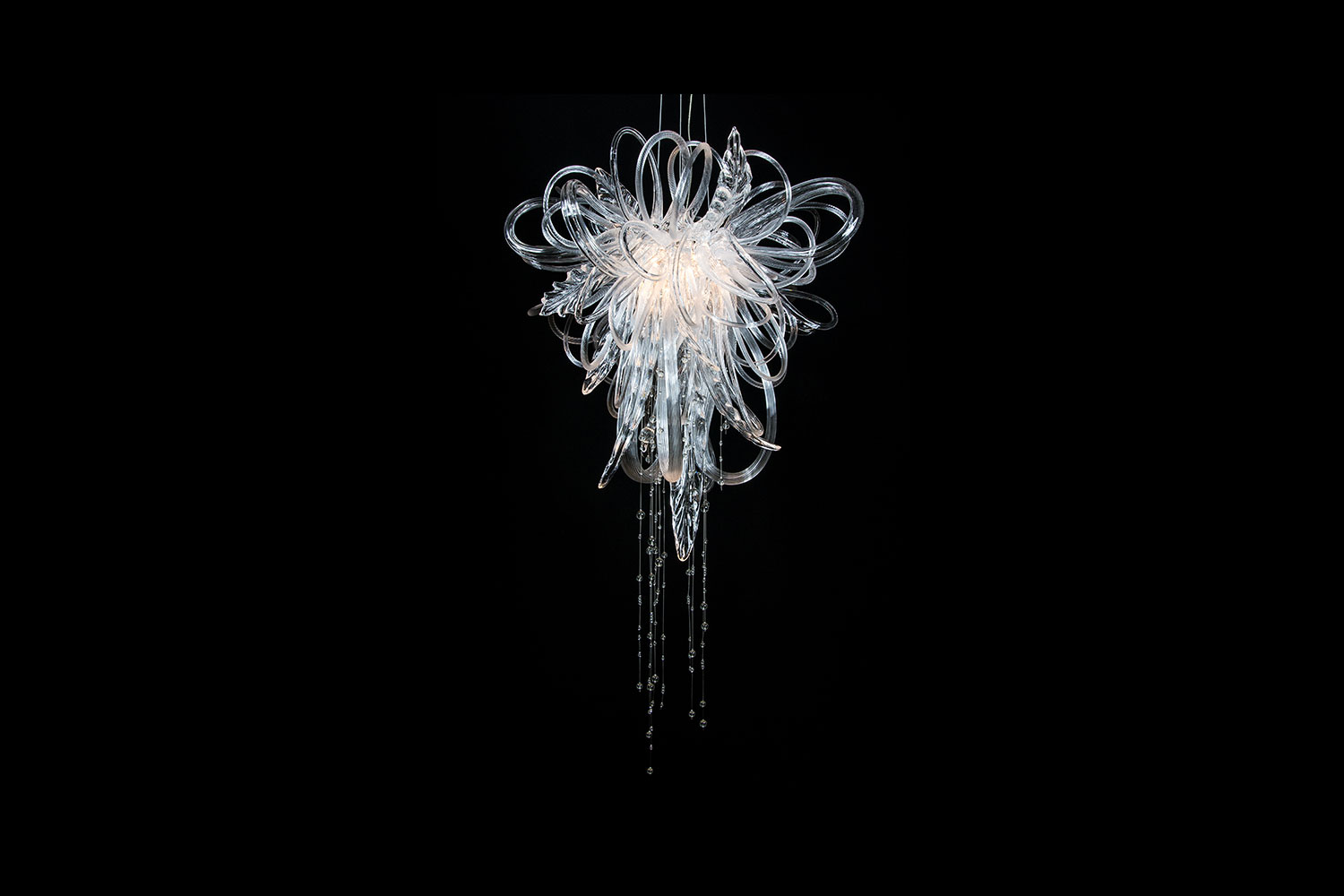 Dew was made from hand blown and sculpted crystal glass. Rike was inspired by the idea of an imaginary plant hidden deep in the lush jungle. The sculpture's texture reflects the dew drops dripping from the surface of the plant.