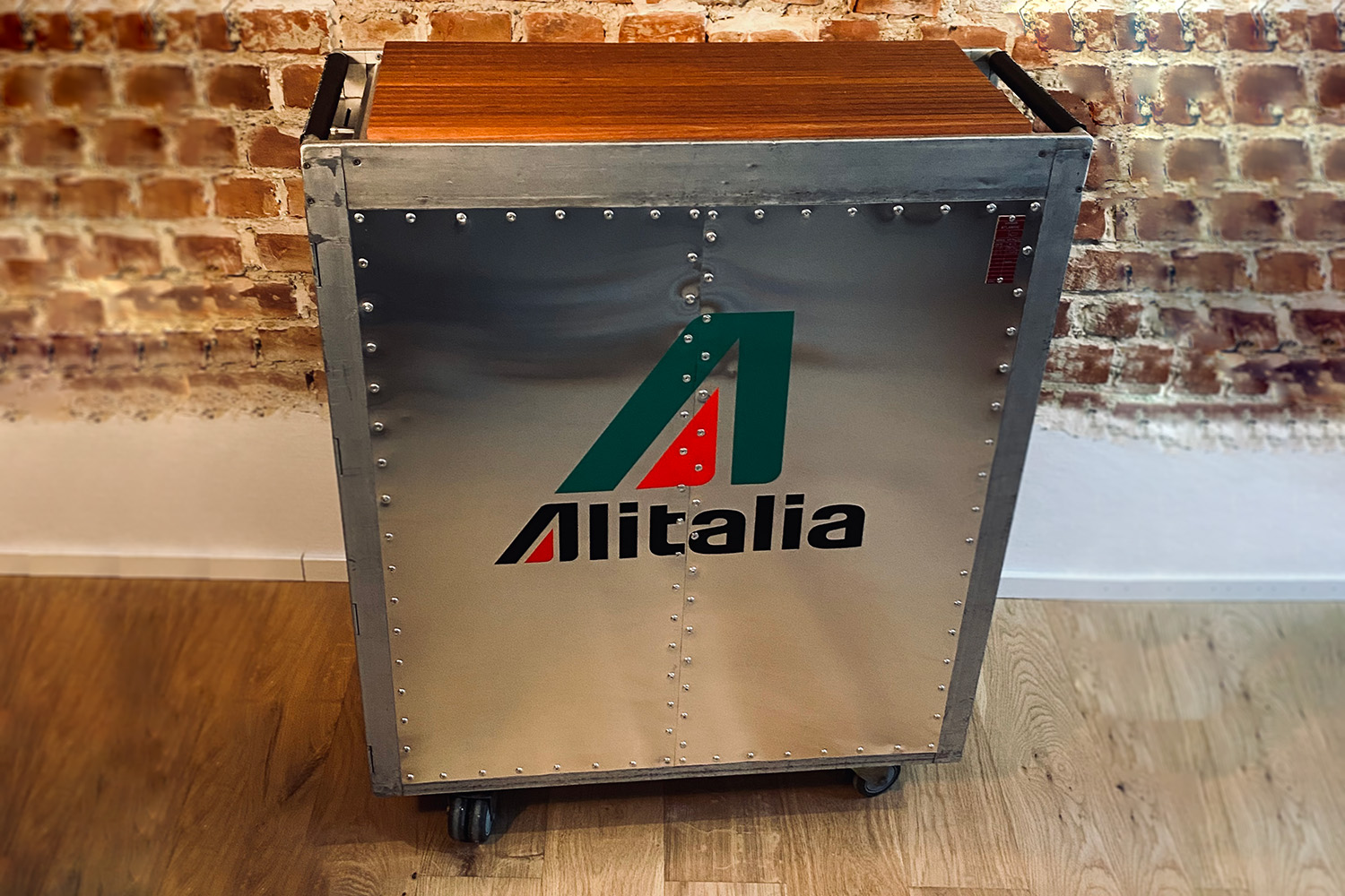 This trolley underwent a bespoke refurbishment to suit a client's wish for a vintage aircraft trolley. Planking with aluminum, wood or leather, wooden tops, tailor made interiors transform it into a piece for use as a bar, furniture or storage space.