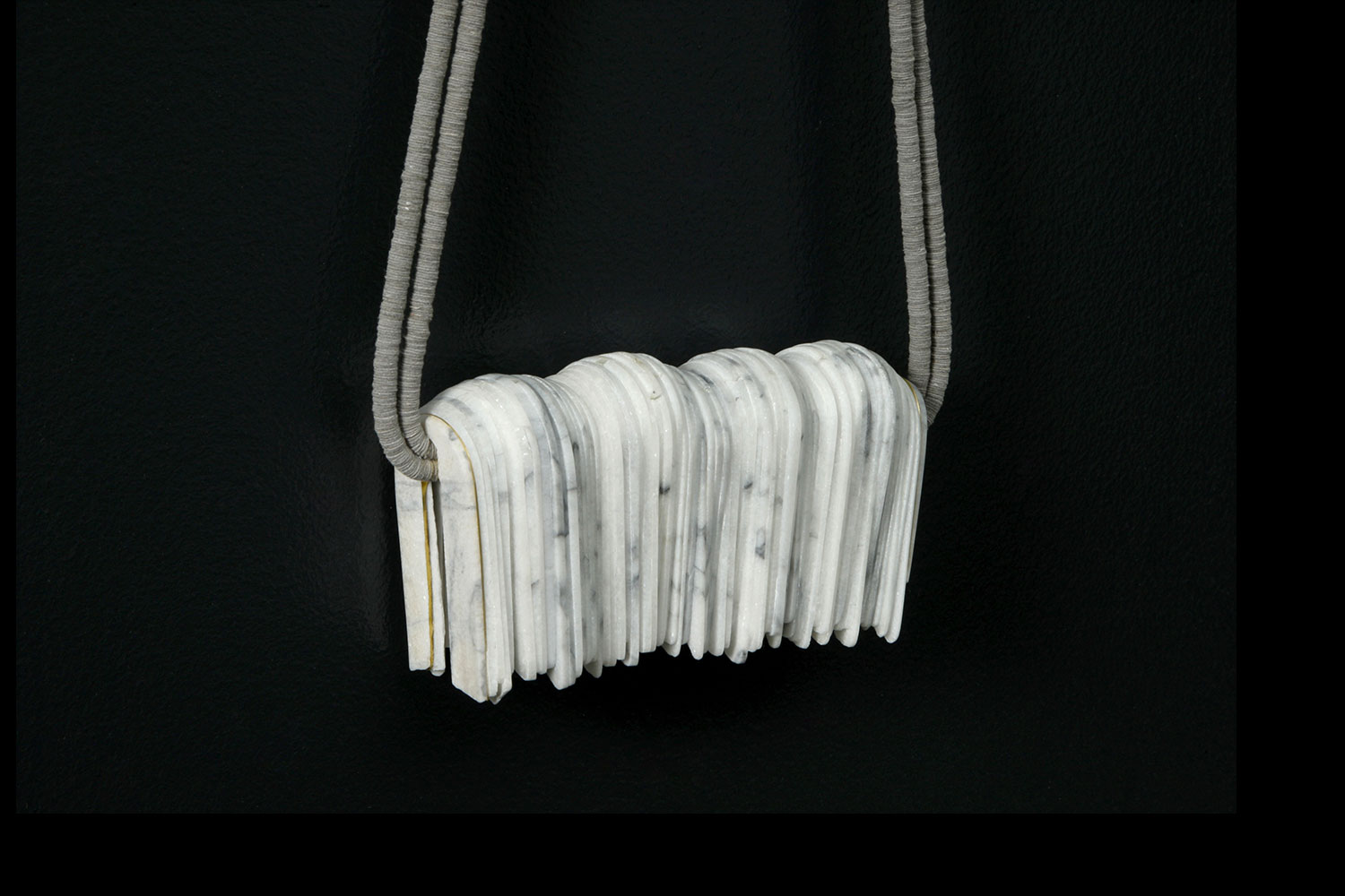This necklace was created with recycled marble from salt shakers that Tarja collected over time. The marble was sliced and polished into thin pieces, then assembled together.