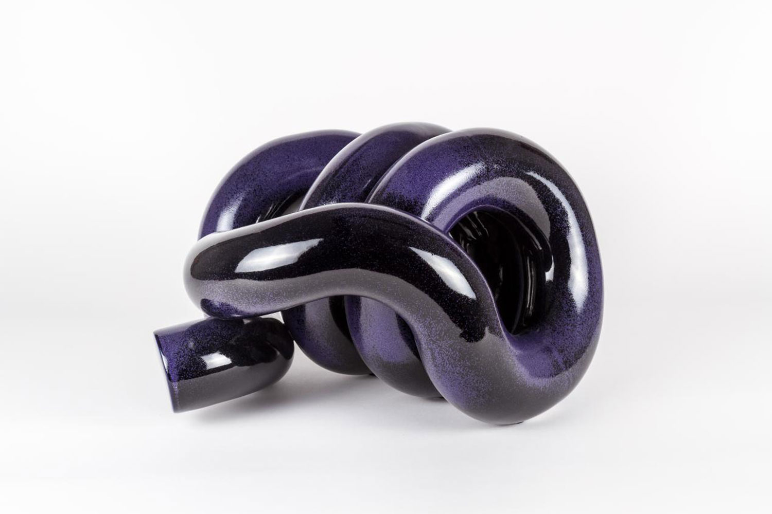 Roger likes to think that we all have our own artistic language and sees each sculpture as a word that will help him define his. Scale, texture and colour are elements that help him set the tone and message of each piece. This glazed purple sculpture has been constructed from several moulded segments of stoneware. Roger does not plan his pieces but rather constructs them until they feel coherent.