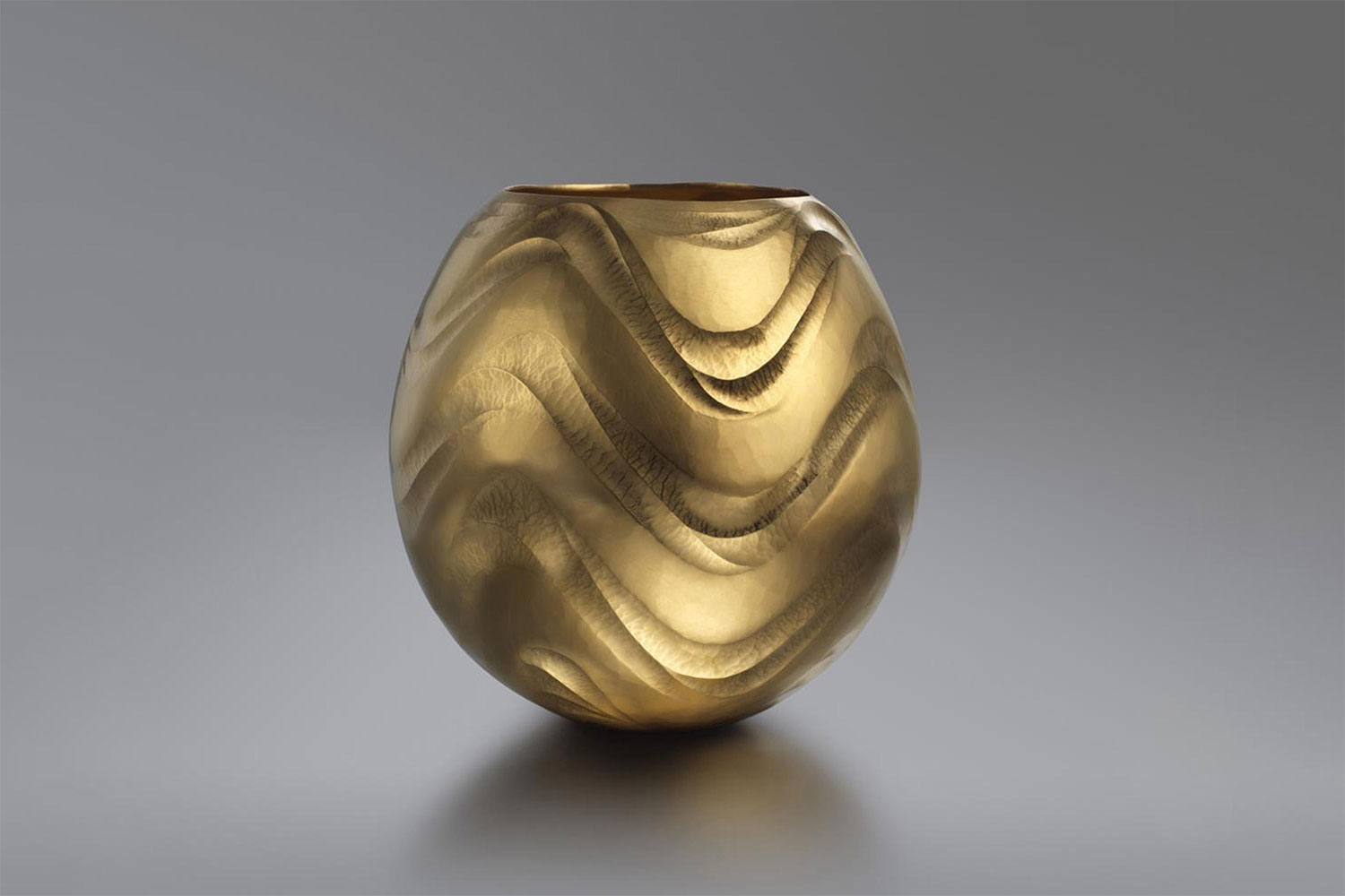This orchid vase was hand raised from a flat sheet of shakudo, a Japanese alloy of gold and copper. Traditional Japanese hammer chasing gives the vessel its sense of flowing movement. The title evokes rhythmic elements in nature: a heartbeat, breathing, a river flow, ice melting and wildlife migrating. There is a natural pause between each heartbeat, and a natural pause between each breath we take, a moment of stillness. The bowl is still, yet the eye moves and follows the contours – shadow to light, high to low.