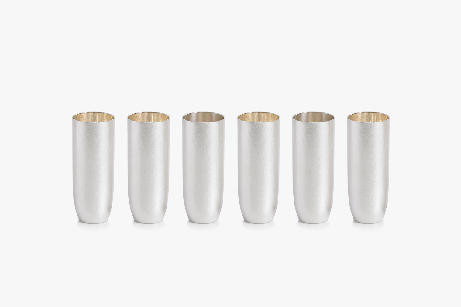 These elegant champagne beakers were hand forged by Marit in fine silver. Due to the slimness of the form, the base was made heavy to give the beaker solidity.