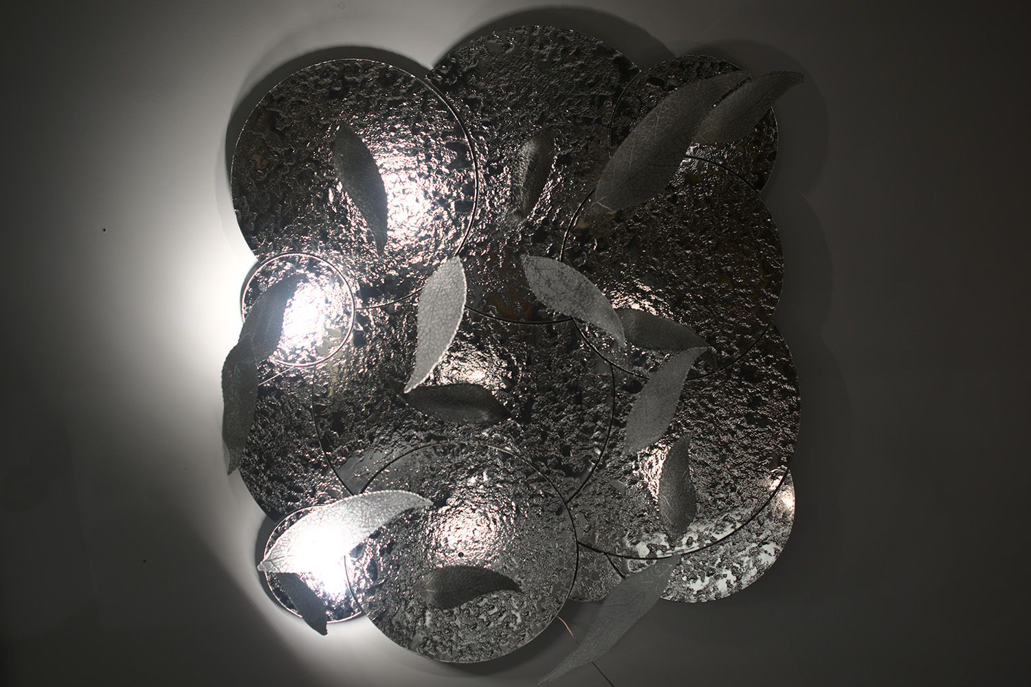 Magic Leaf is a chandelier. Its base is made of interlocking circular panels of silvered thermoformed glass. Fifteen sheets of thermoformed glass hang below the structure. The light sources are integrated into the leaves to create indirect lighting.