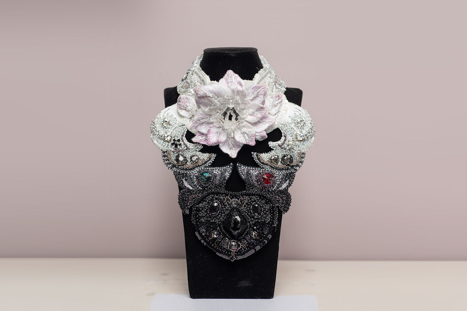 Flower of the Gods incorporates Swarovski crystals, sequins, various types of beads and Italian velvet. It was handcrafted using the Lunéville technique, as well as velvet, stitch and needle embroideries. The lotus flower was chosen by Nadya due to its strong symbolism, since it emerges beautifully from muddy water, reflecting the adversity of human life. She used black and white to convey the duality of souls.