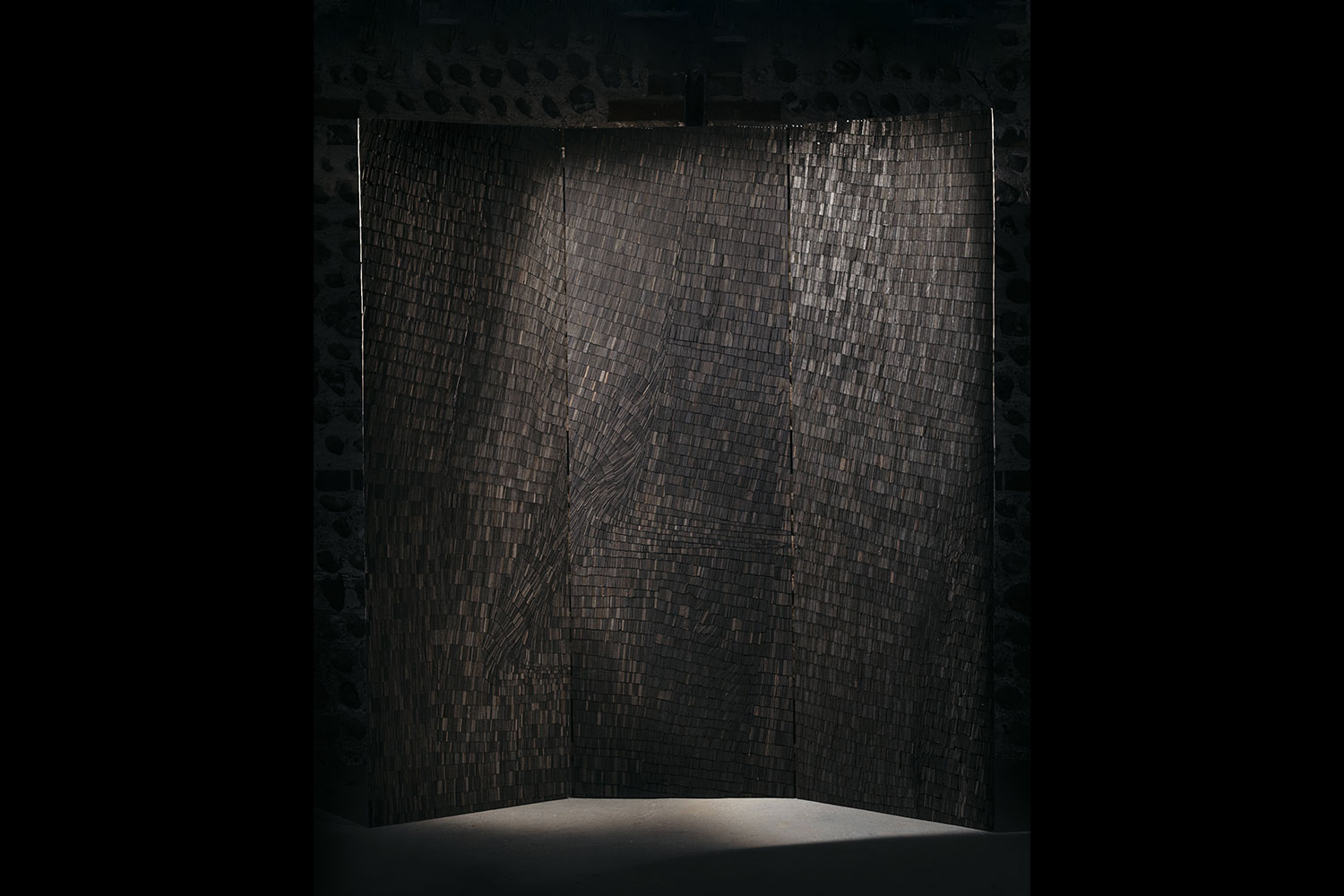 This three-panelled screen was made from oak excavated from a peat bog in the East Anglian Fenlands where it had lain buried for 4,500 to 5,000 years. Over that time the acidity in the water reacted with the tannins in the oak and turned the timber a shade of charcoal. The landscape in East Anglia is flat, bleak and unforgiving, and Wycliffe wanted to convey a sense of the Fens in this piece.