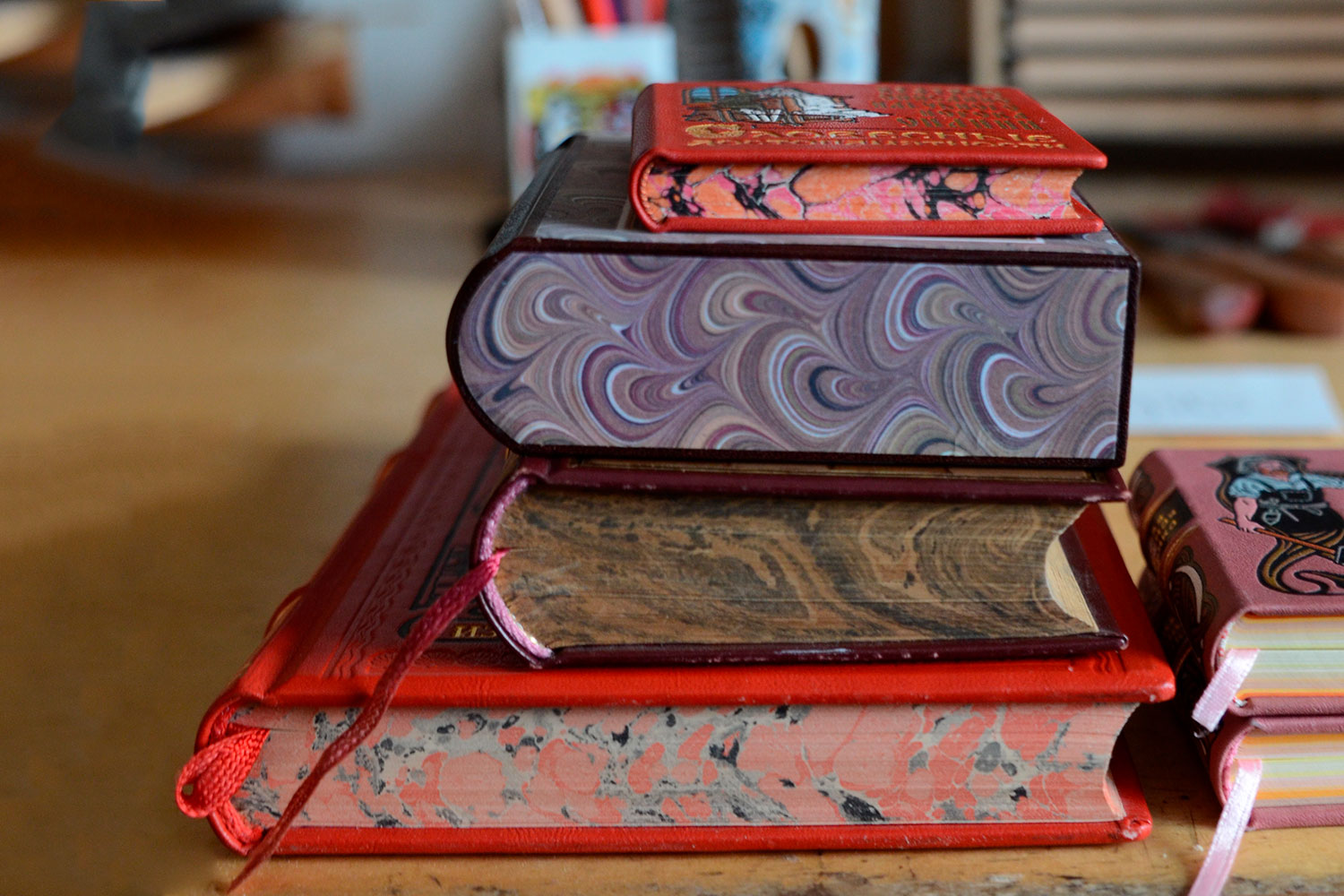 Leonid worked on the decoration of a series of books, marbling the edges of each leather bound book with colourful stone-like designs.